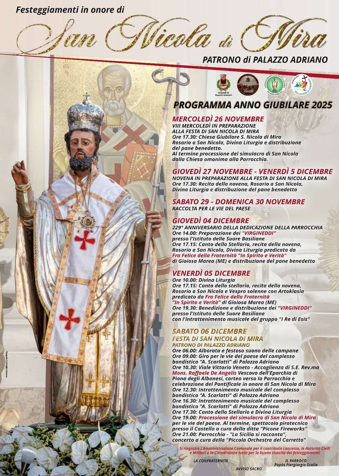 Il 6 dicembre a Palazzo Adriano si celebra San Nicola Vescovo di Myra a cui è dedicata la chiesa più antica del paese, che solo di recente è stata riaperta al culto. La devozione della comunità palazzese per il Vescovo di Myra risale quindi ai tempi della fondazione dl paese. Il santuario di San Nicola, con la sua elegante facciata in stile tardo medievale, fu infatti edificato nel 1490 nei pressi del castello, nella parte alta del centro urbano. E’ qui che sul finire del XV secolo si stabilirono i profughi albanesi fondando il primo nucleo abitativo e edificando una chiesa che venne intitolata a San Marco e a San Nicolò. Accanto a quella chiesa furono costruite le prime abitazioni. Al suo interno si può ammirare l’altare di San Nicola Vescovo di Myra nella Licia, il taumaturgo e Patrono di Palazzo Adriano, e nella parte sommitale della nicchia, un dipinto murale del XVIII secolo raffigura il miracolo di San Nicola e i tre fanciulli.
