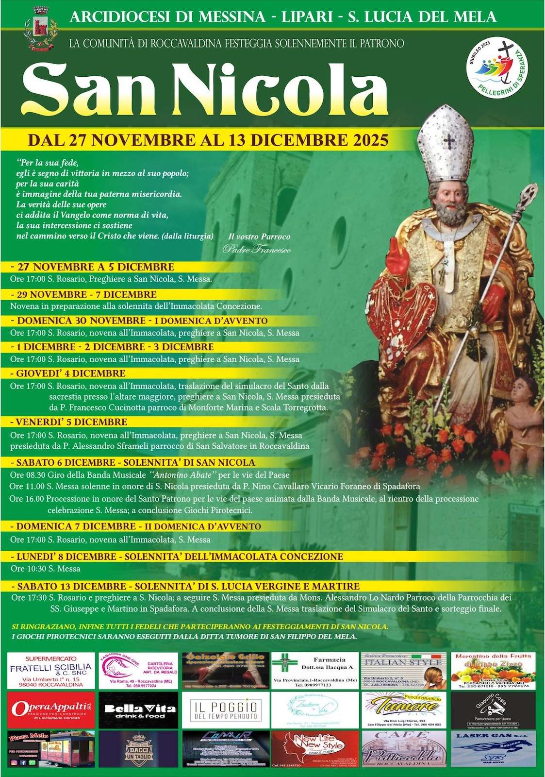 La festa di San Nicola di dicembre a Roccavaldina si apre ufficialmente giorno 4 con la traslazione del simulacro del santo, che dalla sagrestia viene portato all’altare maggiore, e culminano il giorno solenne con la processione pomeridiana per le vie del paese sulle note della banda musicale.