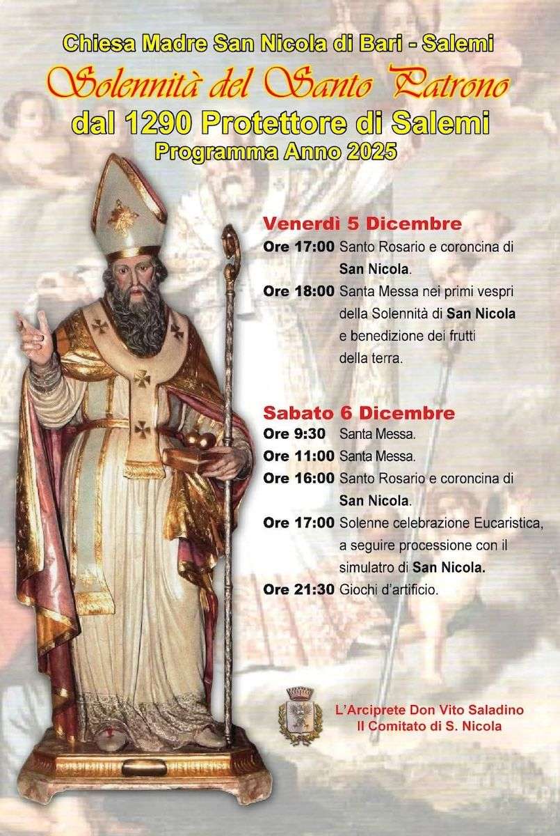 Il 6 Dicembre di ogni anno, la città di Salemi celebra San Nicola di Bari Patrono con una suggestiva processione. La statua lignea del Santo, custodita all’interno della Chiesa Madre, portata a spalla dai devoti, percorre le vie del centro storico seguita da una moltitudine di fedeli.