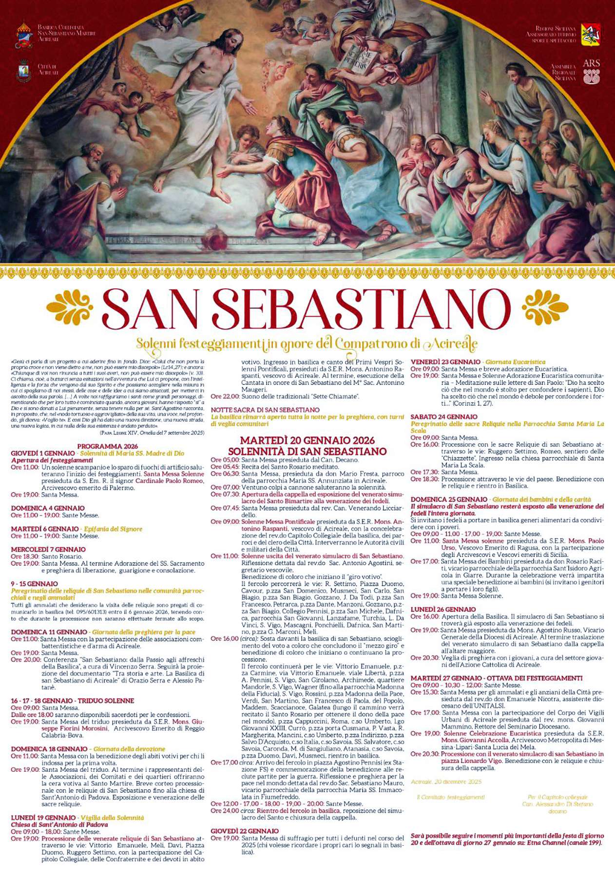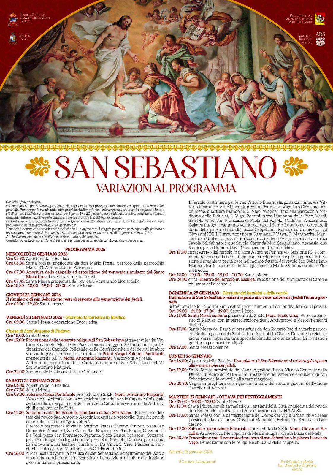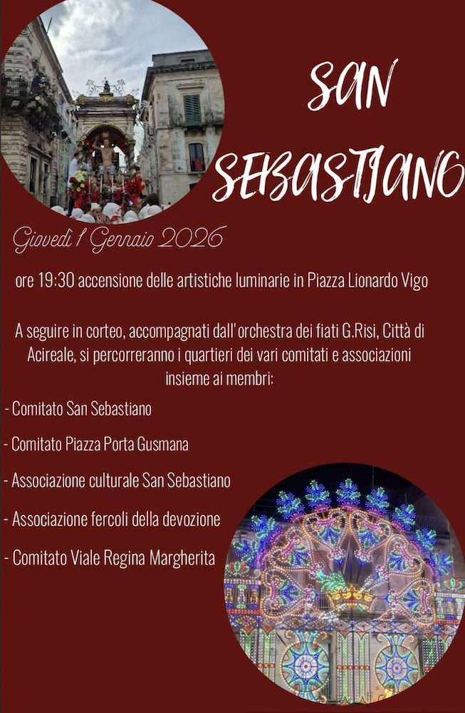 La Festa di San Sebastiano di Acireale si svolge il 20 gennaio, ma le celebrazioni si prolungano per tutto il mese, includendo diversi momenti religiosi, tra cui il triduo, la vigilia, l’apertura della cappella, l’uscita dalla basilica, le varie tappe della processione, il rientro in chiesa e l’ottava, tutti vissuti con grande partecipazione dai fedeli.