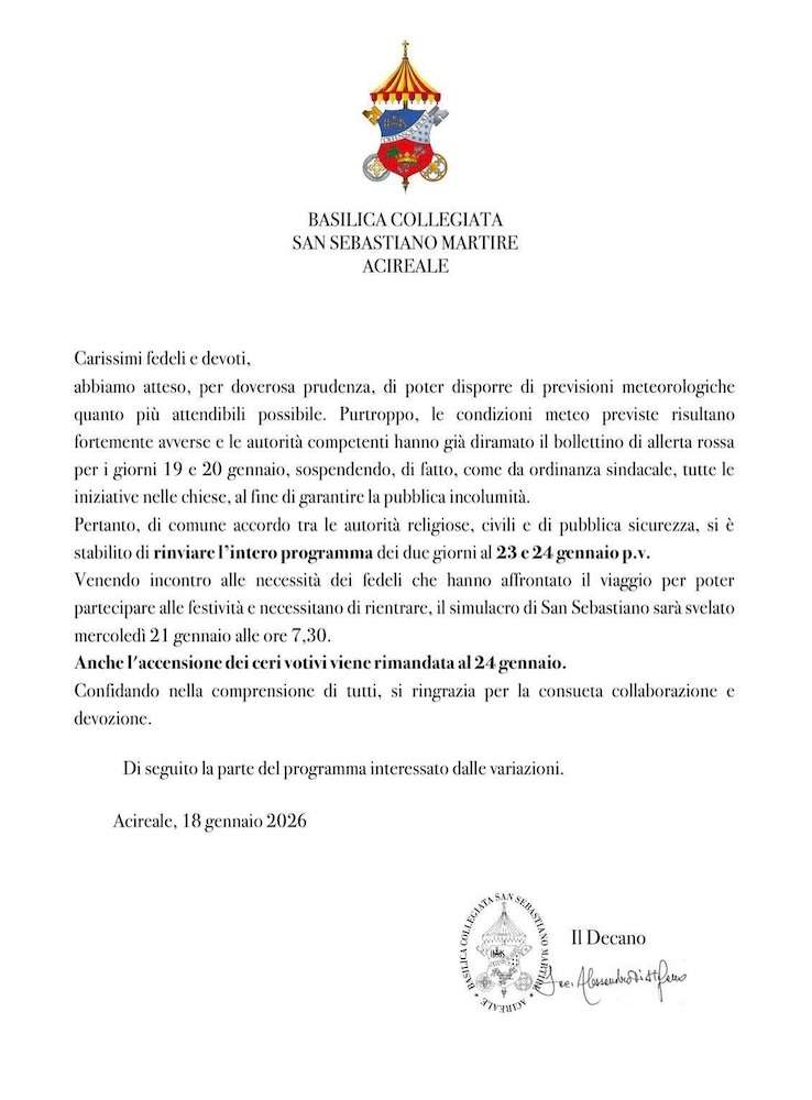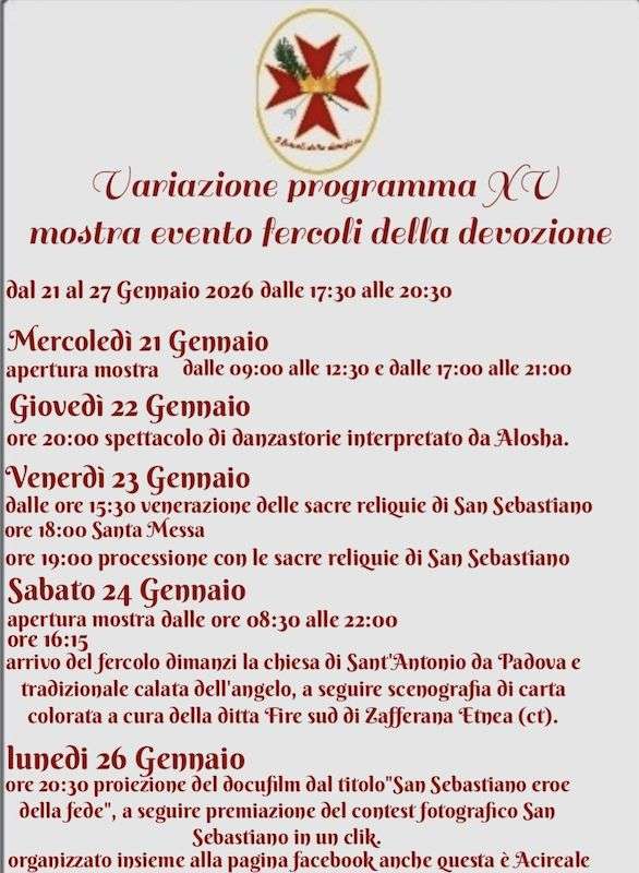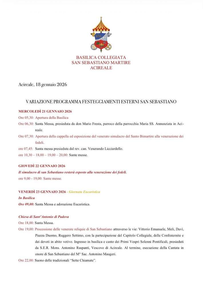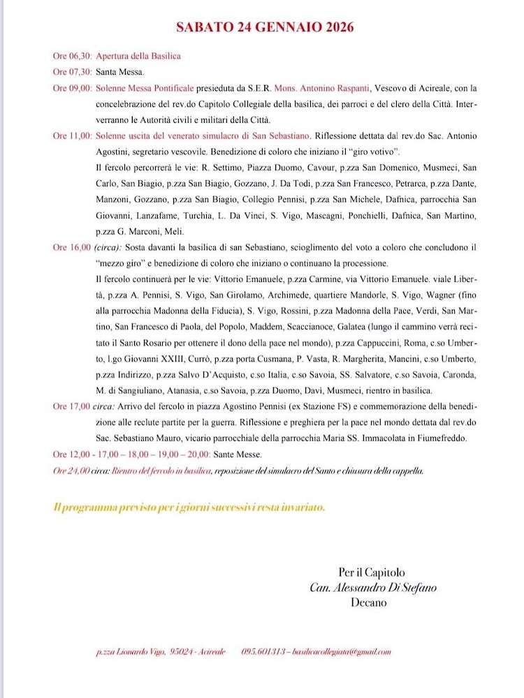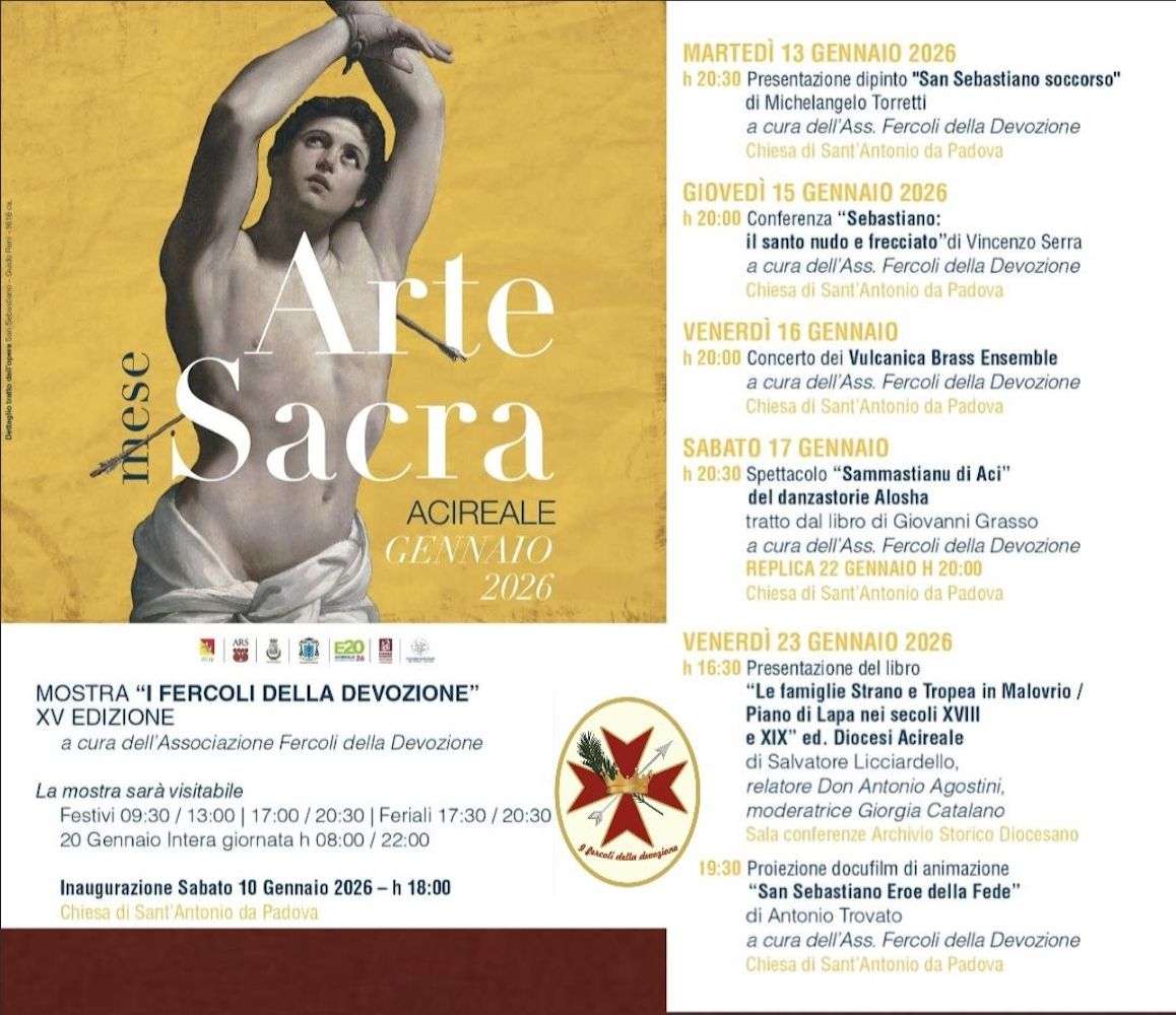 La Festa di San Sebastiano di Acireale si svolge il 20 gennaio, ma le celebrazioni si prolungano per tutto il mese, includendo diversi momenti religiosi, tra cui il triduo, la vigilia, l’apertura della cappella, l’uscita dalla basilica, le varie tappe della processione, il rientro in chiesa e l’ottava, tutti vissuti con grande partecipazione dai fedeli.
