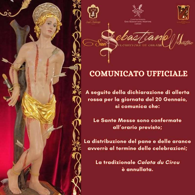 Il 20 gennaio è il giorno della festa di San Sebastiano Martire e si apre con la celebrazione religiosa in chiesa alla quale segue la Messa Solenne con la partecipazione della Confraternita. Nel pomeriggio si potrà assistere alla tradizionale “calata du circu”. E’ usanza preparare in questa occasione, il cosiddetto circu, che consiste in una struttura conica realizzata in legno e rivestita di cudduri (pani a ciambella), arance e rami di alloro. Il circu rappresenta un trofeo votivo e viene disposto nel piazzale antistante la chiesa tra una folla di presenti in trepida attesa. Sorretto alle due estremità con due funi viene sollevato ed abbassato per consentire ai ragazzi di afferrare i cudduri e le arance, in una sorta di competizione. Lo stesso rito si ripete durante le feste di S. Antonio Abate, il 17 gennaio, e di San Biagio il 3 febbraio.