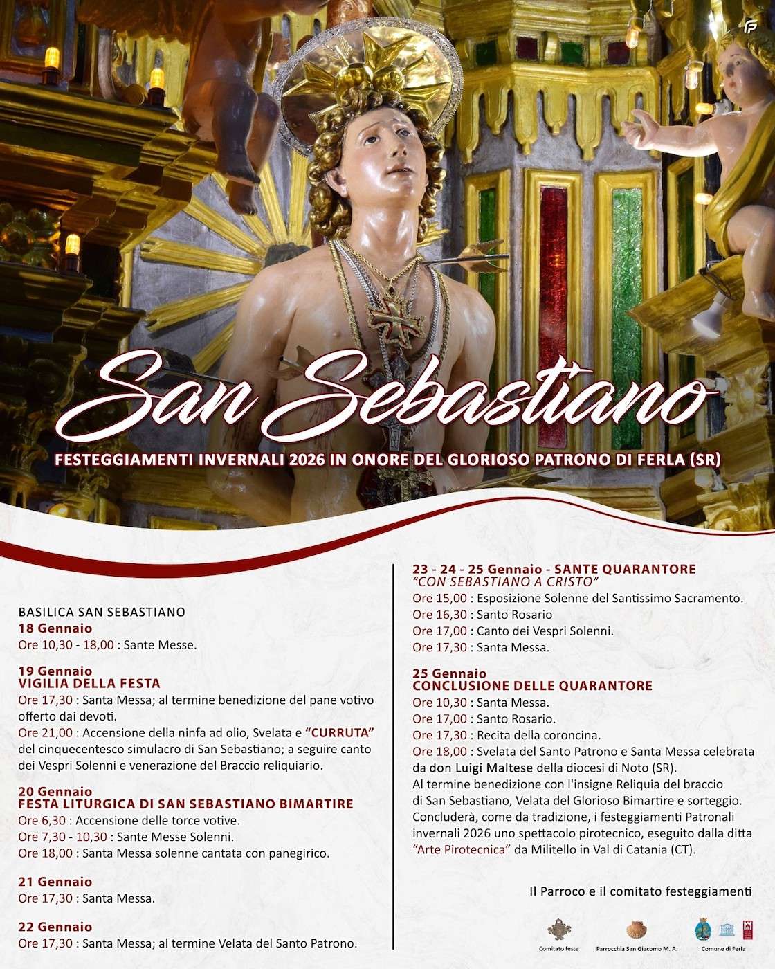 La festa liturgica di gennaio coinvolge tutta la comunità ferlese che vi prende parte con grande devozione. Il giorno della vigilia della Festa di San Sebastiano nella Basilica di Ferla si può assistere alla curruta, ossia alla svelata del pregevole simulacro, che viene prelevato dalla sua nicchia per essere esposto sull’altare tra le preghiere dei fedeli. Segue il canto dei Vespri e la venerazione della Reliquia che in serata viene portata in processione tra le vie illuminate a festa, accompagnata dalla banda musicale e dai fedeli. Hanno così inizio i festeggiamenti in onore di San Sebastiano che culminano il giorno successivo con le celebrazioni delle Sante Messe e si concludono a fine mese con la velata del simulacro e lo spettacolo pirotecnico.