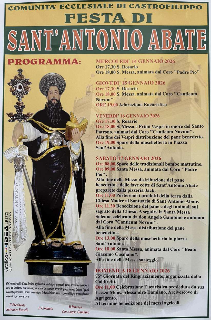 La festa di Sant’Antonio a Castrofilippo, il giro dei tamburi e della banda musicale, la benedizione dei mezzi agricoli, del pane e degli animali, la Messa Solenne e la processione del simulacro. Le origini della festa patronale di Castrofilippo e il Santuario di Sant’Antonio. La festa liturgica del 17 gennaio e la festa esterna di giugno.