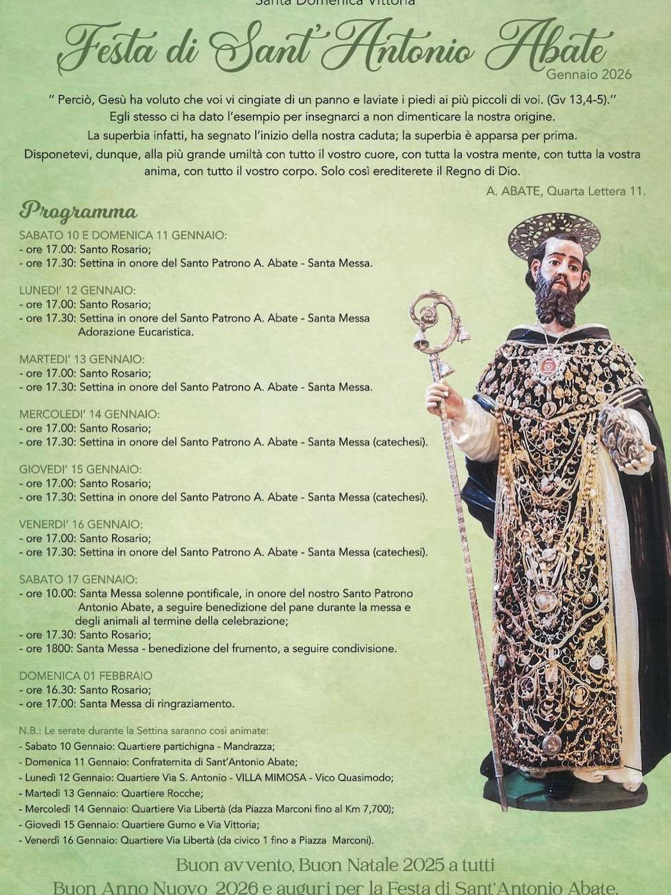 Il 17 gennaio si celebra la festa liturgica di Sant’Antonio Abate a Santa Domenica Vittoria con la tradizionale benedizione del pane, del frumento e degli animali. Le celebrazioni, organizzati dalla Confraternita di Sant’Antonio Abate e dal Comitato festeggiamenti, hanno in programma anche la distribuzione del dolce a Sant’Antonio e del pane e del frumento bollito con i “ziringuri”, piatto tipico della tradizione locale, e i fuochi d’artificio finali.