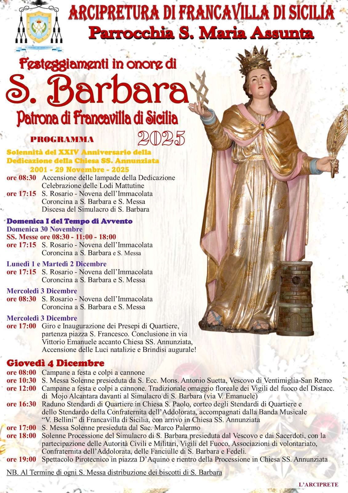 Le celebrazioni in onore di Santa Barbara a Francavilla di Sicilia hanno inizio il 29 novembre con la discesa della statua e la sua collocazione sulla vara. Il simulacro ligneo della Santa Patrona di Francavilla di Sicilia risale al XVIII secolo e si trova esposto nella cappella del transetto della Chiesa della SS. Annunziata del 1550.