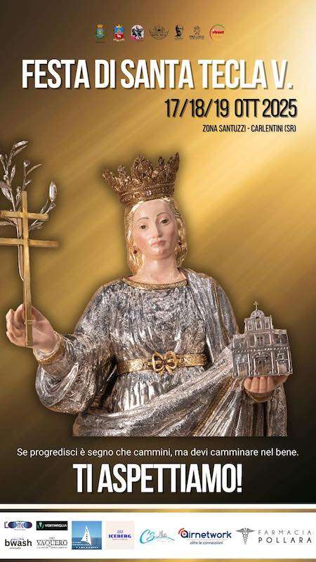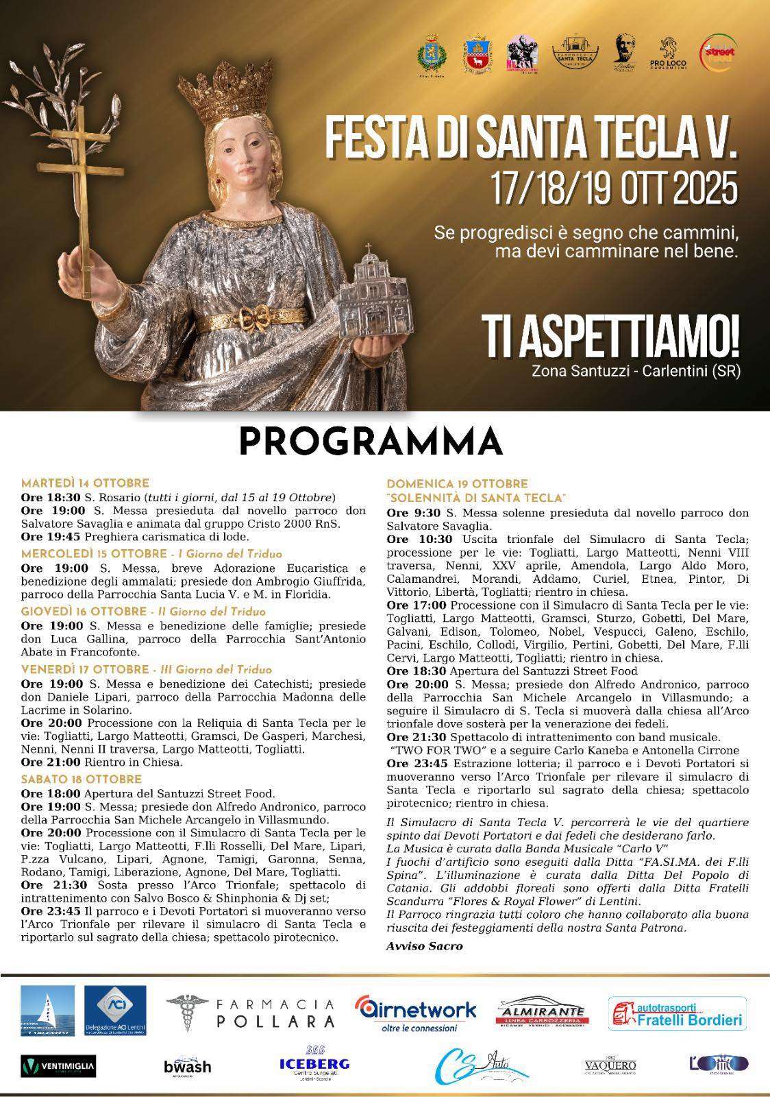 La Festa di Santa Tecla di Carlentini, la chiesa in contrada Santuzzi, le processioni del simulacro, gli eventi in programma, le funzioni religiose e le manifestazioni culturali. Il culto di Santa Tecla a Lentini e Carlentini e le origini della festa patronale del quartiere Santuzzi.