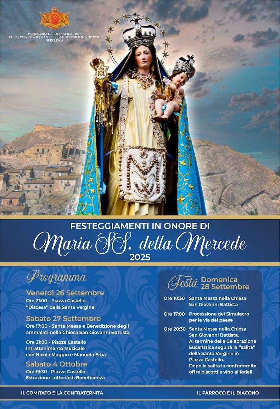 La quarta domenica di settembre, Sperlinga si raccoglie con profonda devozione per celebrare la Festa della Madonna della Mercede, una tradizione antica che unisce fede, storia e comunità. Il culto è legato alla chiesa omonima, situata nella piazza ai piedi del maestoso castello rupestre, simbolo del borgo. Nonostante la semplicità della struttura – una piccola aula unica – il luogo custodisce l’antica “Madonna delle Grazie” e la più recente Madonna della Mercede, posta sull’altare maggiore, vero cuore spirituale della festa.