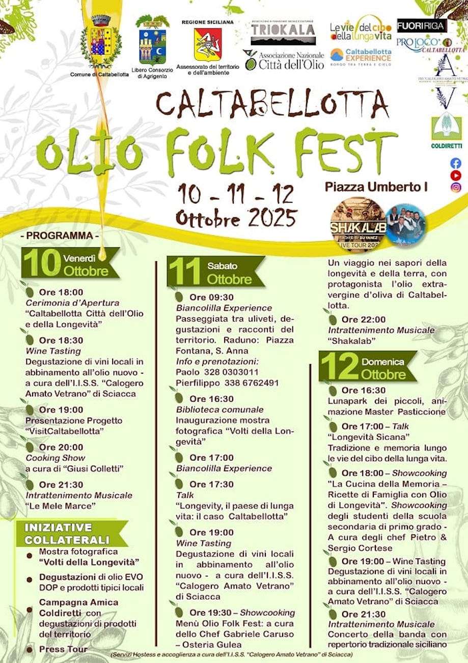 Caltabellotta, con il suo paesaggio mozzafiato e il suo patrimonio unico, si conferma la cornice ideale per celebrare un prodotto d’eccellenza come l’olio prodotto dalla cultivar Biancolilla, simbolo di gusto e tradizione mediterranea. L’Olio Folk Fest rappresenta un viaggio autentico tra cultura, sapori e natura, un evento che lascia un segno indelebile nei cuori di chi vi partecipa, trasformando ogni angolo della città in un inno alla bellezza e alla genuinità. Un appuntamento imperdibile per riscoprire il valore del cibo, del territorio e della comunità, in un clima di festa e condivisione.