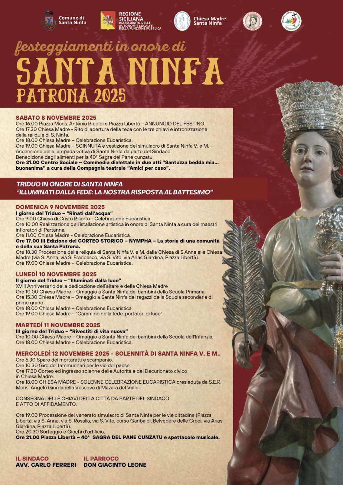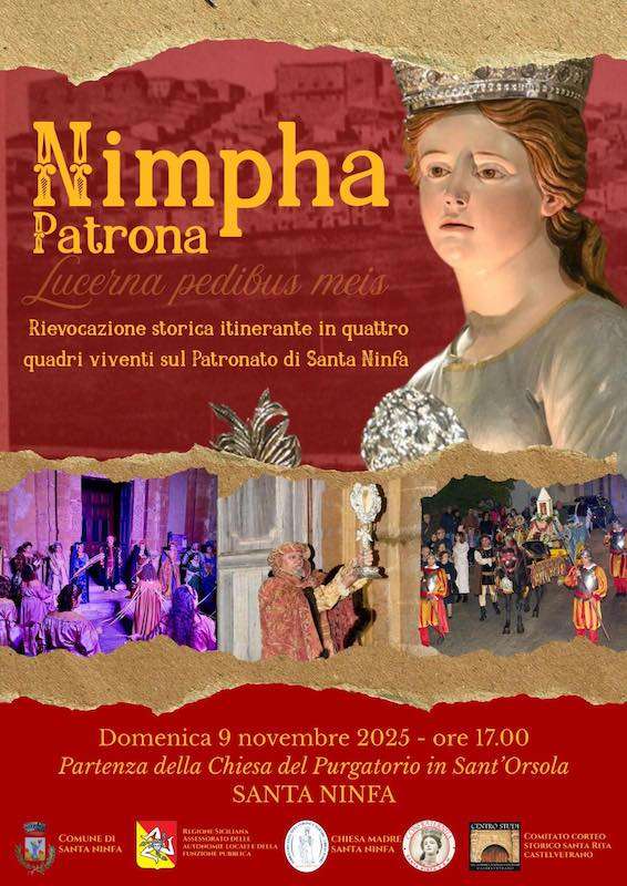Nel 1605, Don Luigi Arias Giardina acquistò il territorio di Rampinzeri, stabilendovisi e lavorando con impegno per sviluppare e valorizzare la zona. Nel 1609, rivolse una richiesta al Viceré di Sicilia per ottenere il diritto di edificare e popolare, diritto confermato da Re Filippo III nel 1613. Sotto la sua guida, questa terra fu nominata “Santa Ninfa” in memoria della martire di Palermo. E proprio in questa terra, nel 1721, grazie all’impegno di Don Federico di Napoli, Principe di Resuttano, arrivò l’omero del braccio di Santa Ninfa, custodito in un reliquiario argenteo e offerto al popolo. Il Principe, desideroso di guadagnarsi il rispetto e la devozione dei suoi sudditi in un’epoca di fervore religioso, si adoperò per acquisire una preziosa reliquia della loro Santa Patrona dalla Santa Sede e in segno di profonda reverenza, collocò l’osso del braccio di Santa Ninfa in un elegante reliquiario d’argento e lo donò ai cittadini. Tale reliquia fu solennemente portata nella terra di Santa Ninfa la seconda domenica di ottobre 1722 e si trova custodita nella Chiesa Madre dedicata proprio a Santa Ninfa. Questa chiesa rappresenta il cuore pulsante della devozione dei cittadini, che ogni anno alla Santa Patrona Santa Ninfa dedicano tre giorni di celebrazioni. Il culmine è rappresentato dalla processione, momento in cui la fede e la tradizione si fondono in un unico sentimento. Uno degli eventi più attesi è il Corteo Storico, che rievoca la storia della fondazione del paese e l’arrivo delle reliquie. Quest’anno, il corteo si terrà il 10 novembre, promettendo di essere uno degli appuntamenti più emozionanti e suggestivi della festa. Si svilupperà attraverso quattro quadri, vedrà la partecipazione dei Giocolieri di Stendardi di Delia e dei Tamburi Aragonesi di Castelvetrano e si concluderà in Piazza Libertà con la festa barocca a cui prenderanno parte i gruppi storici e “Le Sibille”, artiste specializzate in danze storiche.