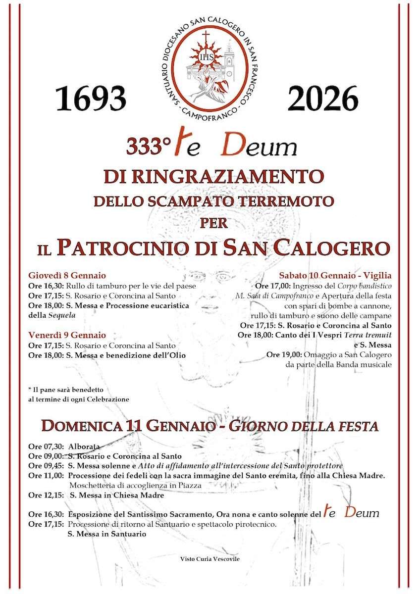 Durante il terribile terremoto del 1693, numerosi fedeli si radunarono nella piccola chiesa di San Francesco a Campofranco, invocando l’intercessione di San Calogero per la cessazione del sisma. Portarono in processione la statua del Santo, pregando ferventemente per essere salvati dalle scosse devastanti. Secondo la tradizione locale, si ritiene che, non appena la statua fu posizionata a terra, il terremoto si arrestò improvvisamente, lasciando Campofranco sorprendentemente illeso. Profondamente grati per questo miracolo, i cittadini di Campofranco decisero di istituire una seconda celebrazione annuale in onore di San Calogero, come segno di eterna gratitudine verso il loro protettore. Così, ogni anno l’11 gennaio, la comunità si riunisce per la Santa Messa seguita da una solenne processione che inizia puntualmente alle 11, perpetuando il ricordo di quella salvifica intercessione. Questa ricorrenza è denominata San Caloieru u poviru.