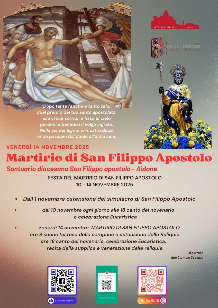 San Filippo apparteneva al gruppo dei dodici apostoli menzionati nei Vangeli. La sua figura emerge in modo significativo nel Vangelo di Giovanni. Durante l’episodio della moltiplicazione dei pani, è a lui che Gesù rivolge la domanda su come procurarsi il cibo per nutrire la grande folla. La storia di San Filippo di Aidone ci racconta che la festa dell’1 maggio è nota come la “festa dei forestieri”. Ma la devozione ad Aidone non si esauriva in un solo giorno: San Filippo era infatti celebrato anche l’1 giugno, nella festa degli Aidonesi, e il 14 novembre, in ricordo del suo martirio.