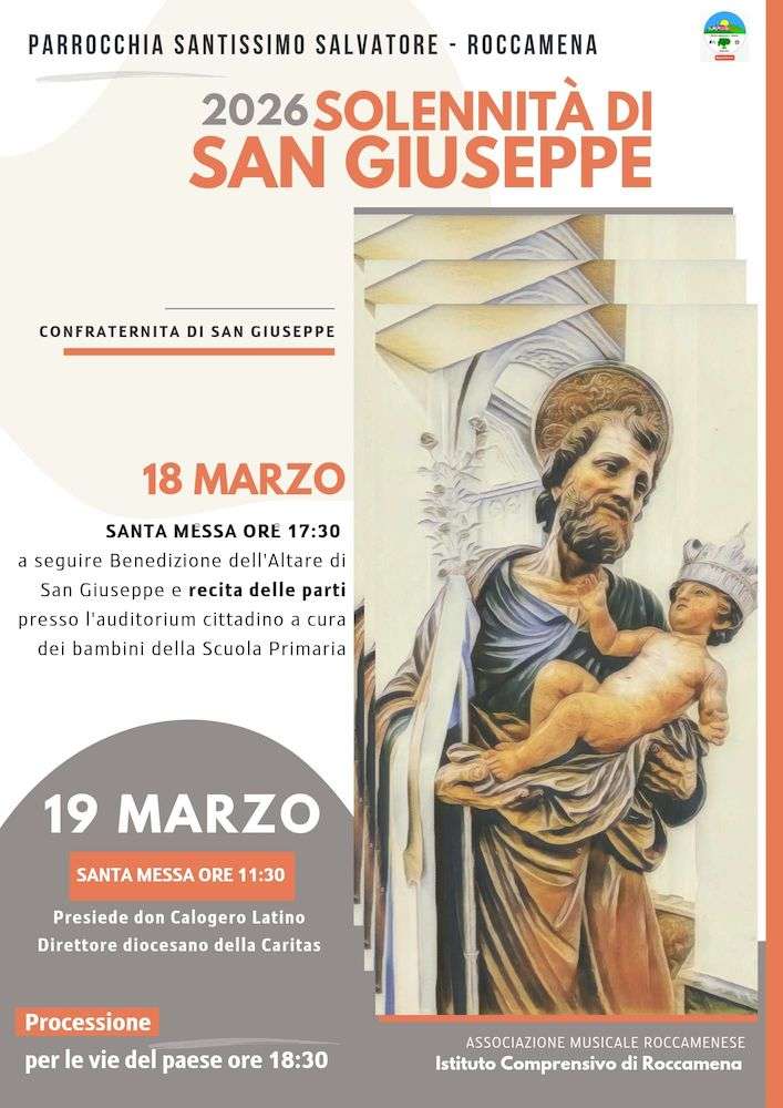 La festa di San Giuseppe di marzo a Roccamena ha inizio con la scinnuta di la Vara di San Giuseppe dalla nicchia dell’altare centrale della Chiesa e la benedizione dell’Altare della Fraternità, allestito con il contributo della comunità, che partecipa attivamente donando pietanze per la festa. Il 19 marzo, il paese si anima con il giro della banda musicale, seguito dalla celebrazione della Messa con la benedizione e distribuzione del pane. Il pomeriggio si conclude con la tradizionale processione e una degustazione di fritture e dolci presso l’Altare della Fraternità. In entrambe le occasioni, la festa si distingue per la sua dimensione collettiva e per la capacità di unire la comunità in un’atmosfera di devozione, convivialità e tradizione, facendo di Roccamena un luogo di ritrovo e celebrazione, capace di trasmettere l’autentica essenza delle tradizioni locali.