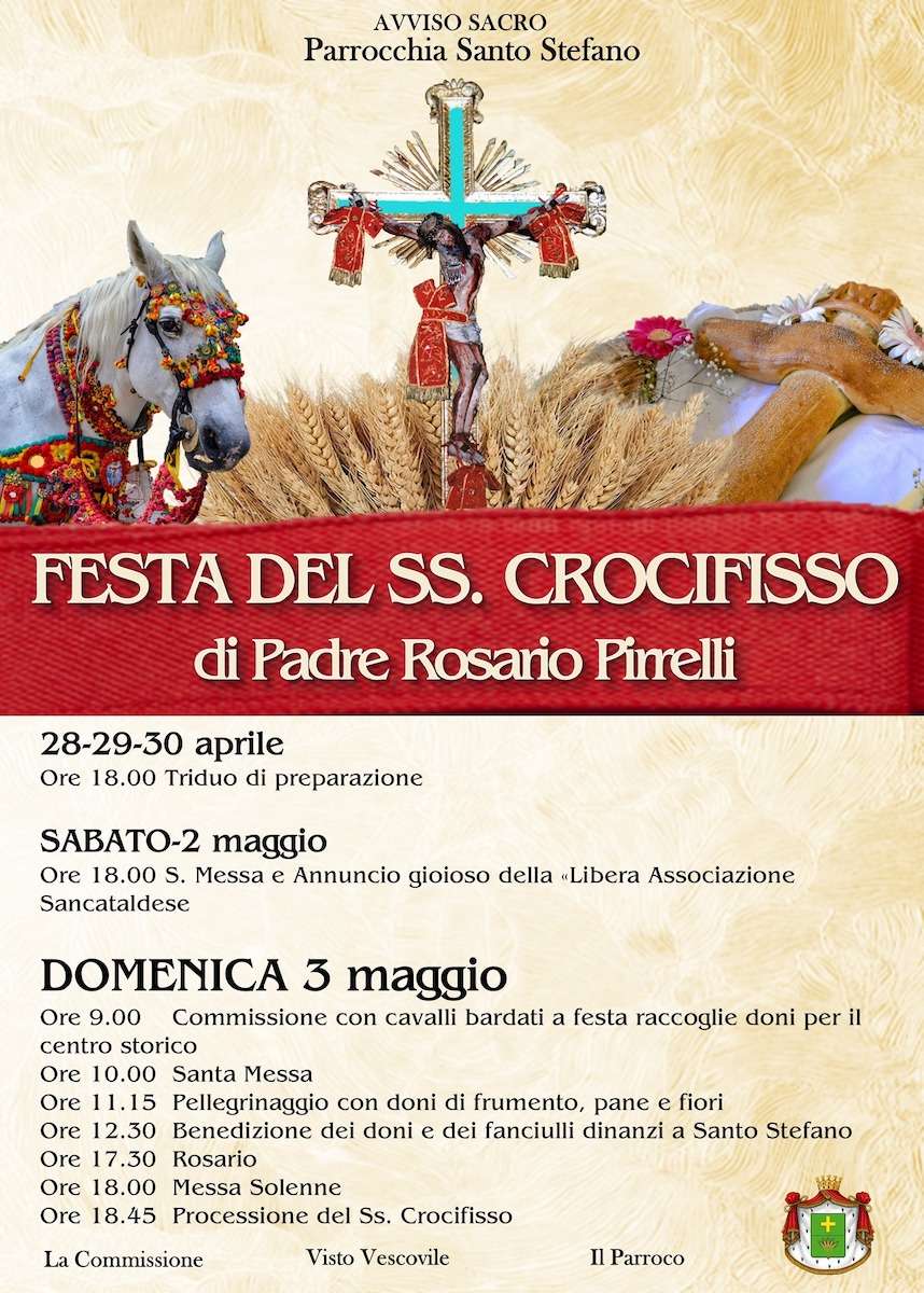 La Festa del SS. Crocifisso di Padre Rosario Pirrelli, che si svolge a San Cataldo ogni quarta domenica dopo Pasqua, è uno degli appuntamenti più sentiti e identitari della comunità, capace di raccontare l’anima autentica della città attraverso fede, tradizione e memoria collettiva. Istituita ufficialmente nel 1851, questa celebrazione affonda le sue radici nel mondo contadino e continua a rinnovarsi mantenendo intatti i suoi simboli più profondi: il grano, il pane e i fiori, espressione di vita, sacrificio e rinascita.