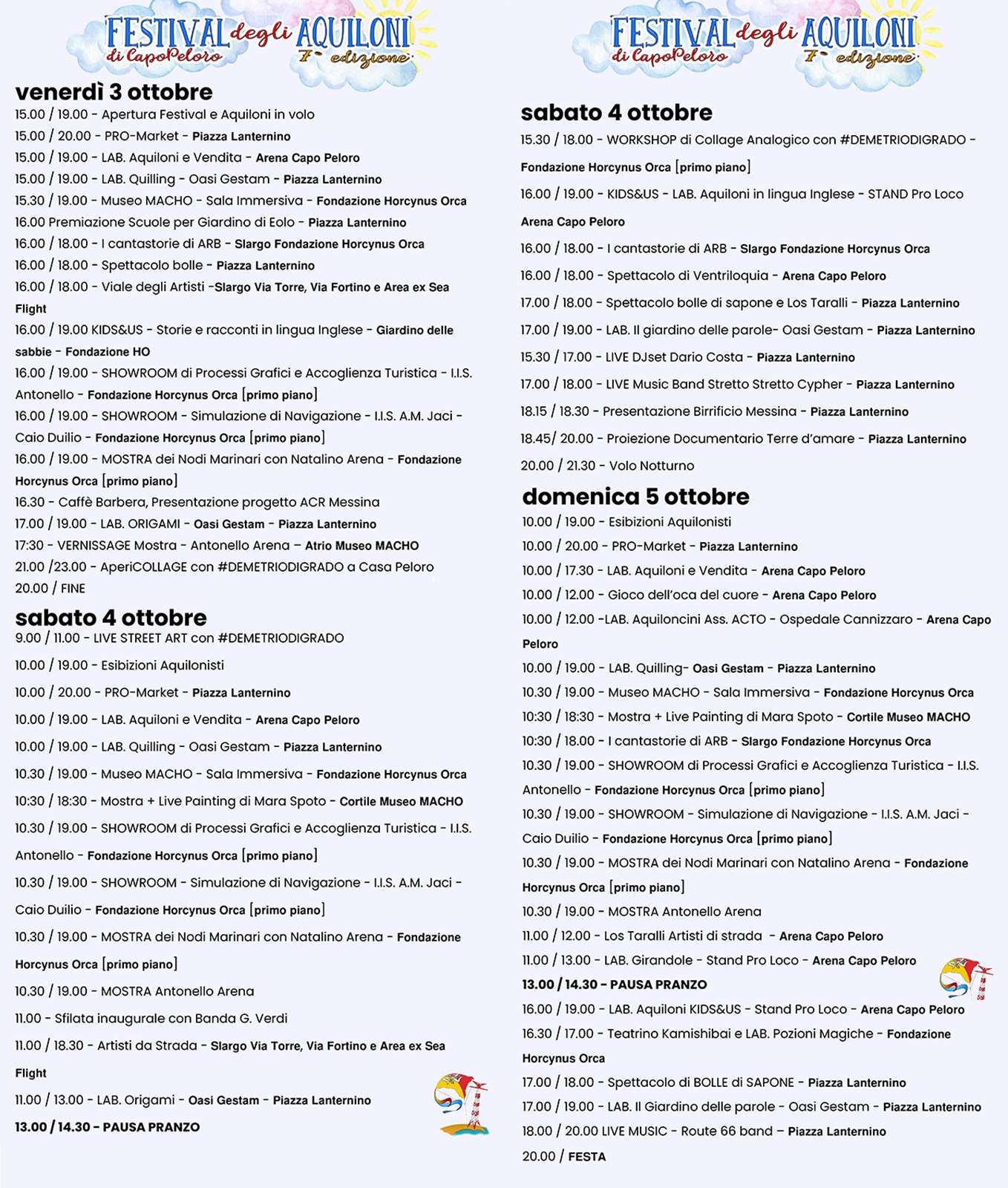 A Capo Peloro per il festival più colorato dell’anno i tre Capi della Sicilia saranno legati ad un unico filo. Il festival degli aquiloni coinvolgerà la bellissima spiaggia di Capo Peloro di Torre Faro nella zona sotto il Pilone che durante la festa si animerà con mostre, laboratori, musica e tanto altro. Nei giorni della manifestazione organizzata dalla Pro Loco Capo Peloro saranno organizzati i campi di volo dove gli aquiloni potranno librarsi nei cieli sia nelle ore di luce che in volo notturno. Saranno tre giorni da trascorrere col naso all’insù organizzati all’insegna della sostenibilità e della condivisione. Per i più piccoli vi saranno l’animazione ed anche i laboratori dove potranno apprendere le tecniche per costruire e fare volare gli aquiloni e per l’occasione si potrà fare visita al Museo “Macho” della Fondazione Horcynus Orca.