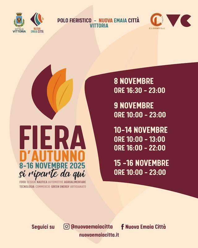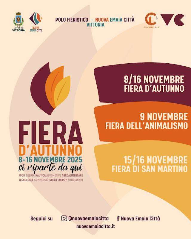 Da oltre cinquant’anni, il Polo Fieristico Emaia continua a essere motore di sviluppo e promozione per Vittoria e per l’intera provincia di Ragusa, con l’obiettivo di coniugare radici e futuro, tradizione e modernità. La Fiera d’Autunno ne è la massima espressione: un evento che racconta la Sicilia più autentica, quella che sa reinventarsi senza mai perdere la propria identità.