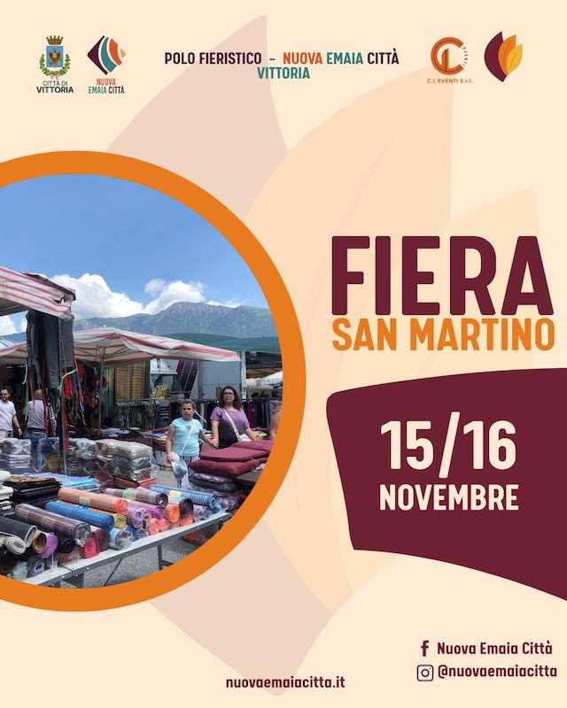 Nata nel 1966 come naturale erede della celebre Fiera di San Martino, la Fiera Emaia di novenbre è diventata un punto di riferimento per la vita economica, culturale e sociale del territorio. Da allora, ogni edizione rinnova lo spirito di festa della Novembrina che accompagna Vittoria da più di 300 anni, quando le vie del centro si riempivano di bancarelle colorate, profumi di dolci e vino novello, e l’allegria popolare dava inizio alla stagione autunnale.