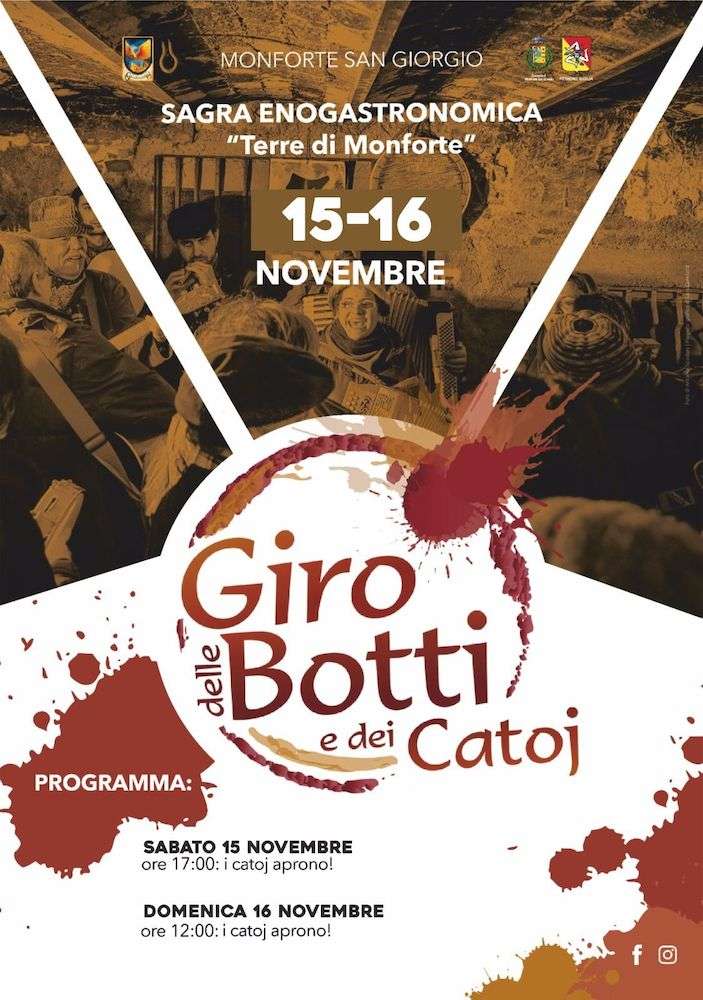 A Novembre il centro storico di Monforte San Giorgio si anima con il consueto Giro delle Botti e dei Catoj, tra cantastorie, friscalettari e gruppi folkloristici che intratterranno i visitatori con balli, musica e vecchie canzoni popolari. La manifestazione, giunta quest’anno alla sua settima edizione, è organizzata dall’Associazione Storico Culturale ed Artistica Katabba, che da anni si occupa della riscoperta delle vecchie tradizioni locali. Nei giorni della manifestazione si apriranno le cantine e i tipici catoj monfortesi.