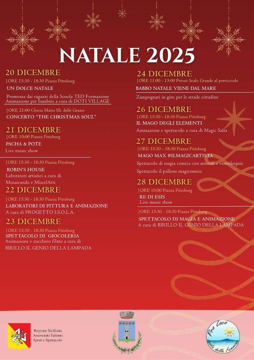Il Natale a Isola delle Femmine prende il via con l’accensione del grande albero in piazza Umberto I, dando il via a un ricco programma di eventi. Musica, spettacoli, specialità enogastronomiche, giochi di luci, il villaggio di Natale, il presepe vivente e l’amatissimo Babbo Natale “che vien dal mare” accompagnano la comunità fino alla magia dell’Epifania. Nel suggestivo scenario del Cortile Baglio prende vita il Presepe vivente, arricchito da degustazioni di prodotti tipici locali.