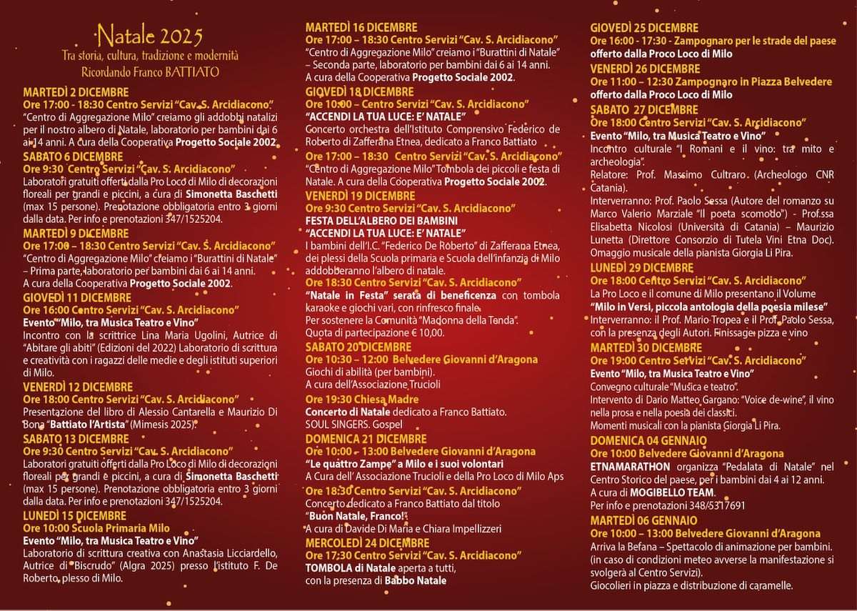 Durante il periodo natalizio a Milo si organizzano eventi, manifestazioni e mostre a tema e gli ospiti saranno allietati con la degustazione dei prodotti tipici locali.