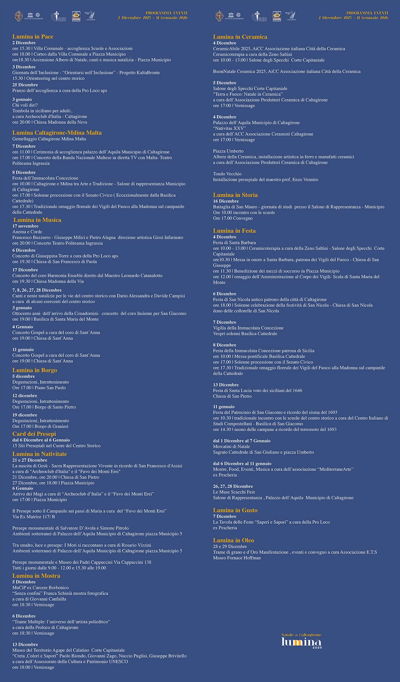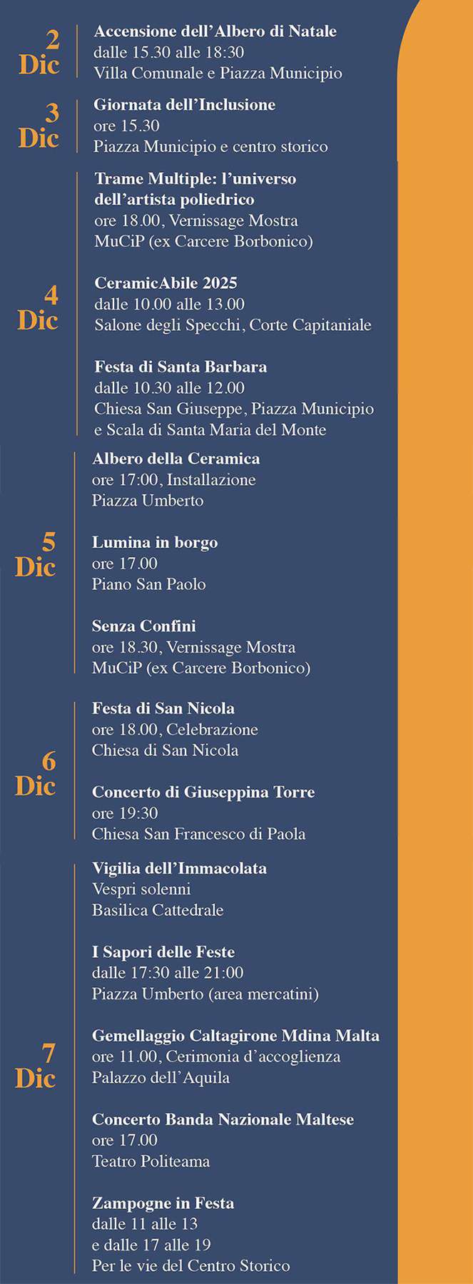 Il Natale a Caltagirone prende vita già dai primi giorni di dicembre, dando il via a un ricco calendario di eventi: mercatini natalizi, presepi artistici, concerti, canti tradizionali, mostre e molto altro ancora. Questo periodo è un momento di profonde tradizioni e celebrazioni popolari che animano la città, rinomata per le sue pregiate ceramiche e la forte identità culturale. Il Natale a Caltagirone è un’esperienza coinvolgente che avvolge residenti e visitatori in un’atmosfera unica, intrecciando arte, spiritualità e cultura.