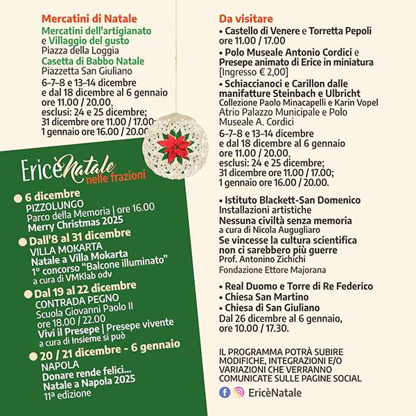 EriceNatale 2025 è in programma dal 6 dicembre al 6 gennaio 2026.