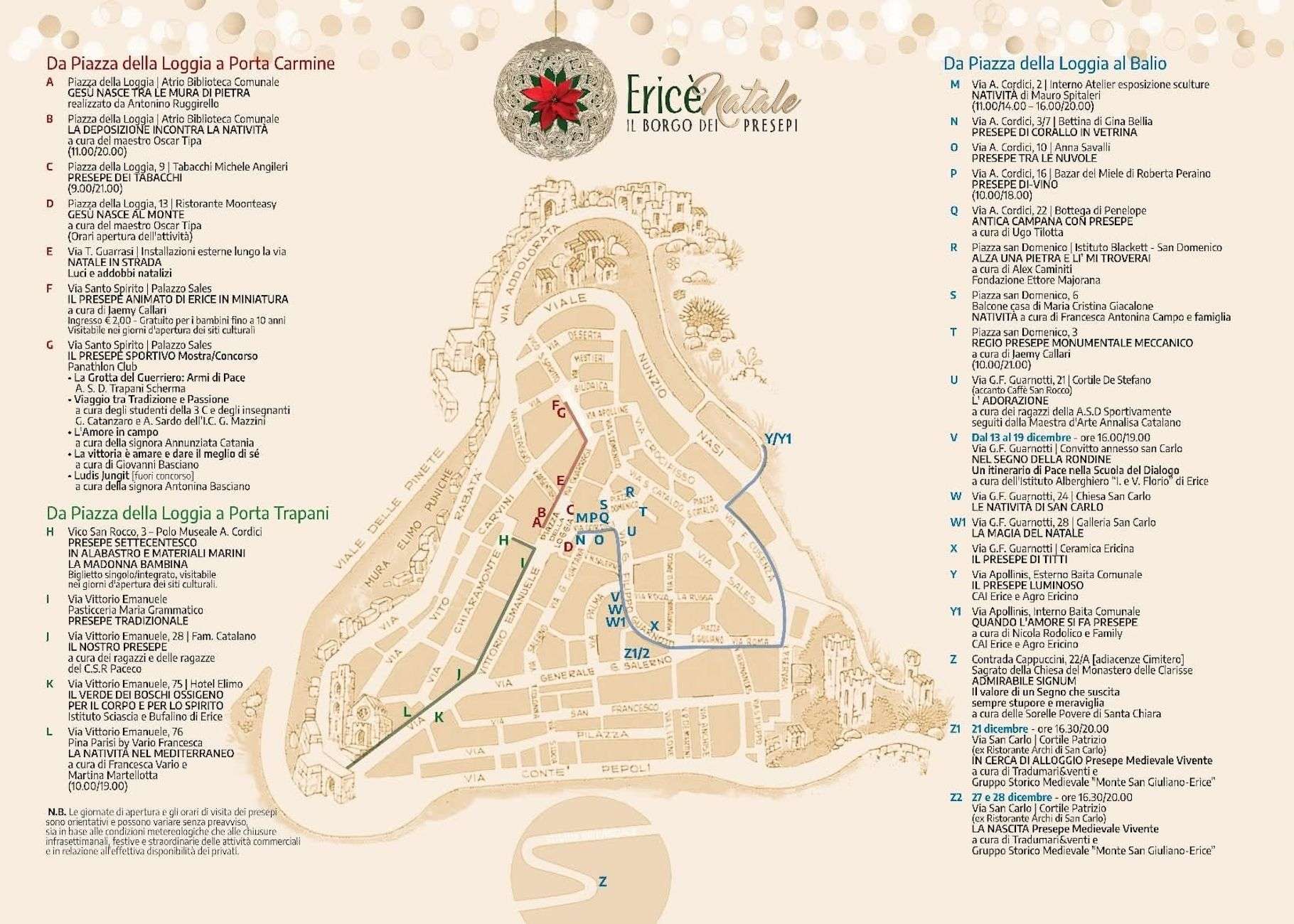 La kermesse EricèNatale è in programma a partire dal giorno dell’Immacolata con tantissimi eventi. Nei cortili, nelle botteghe, nelle chiese ed anche nelle abitazioni private saranno allestiti i presepi, di materiali e stili diversi, che faranno bella mostra di sé accanto al presepe monumentale meccanico del maestro Jaemy Callari che, con i suoi centotrenta personaggi realizzati a mano, e sempre in movimento, sorprende ed affascina i tanti visitatori.