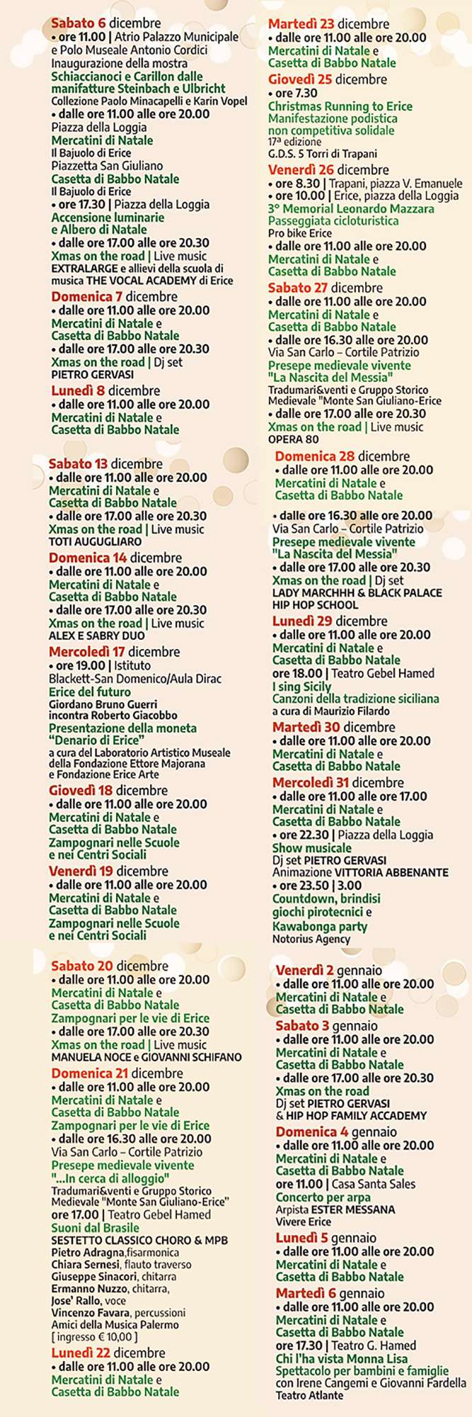La festa di Natale a Erice si arricchirà di sapori tradizionali, di odori e di profumi delle tipicità del passato, grazie anche ai tradizionali Mercatini di Natale di Erice che, con le loro baite di legno addobbate a festa, torneranno a rallegrare Piazza della Loggia. Nei mercatini e nelle botteghe lungo le stradine del borgo si potranno acquistare i prodotti della gastronomia locale e i manufatti di artigianato. Non mancheranno le melodie natalizie, gli zampognari e i Babbi Natale che sfileranno per le vie del borgo, i concerti musicali e gli eventi culturali.