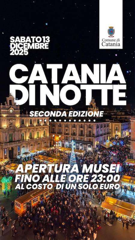 A partire dall’8 dicembre, il Palazzo degli Elefanti diventa il fulcro dell’illuminazione natalizia scenografica, creando un suggestivo punto di riferimento per cittadini e turisti. Il cuore delle celebrazioni è rappresentato dai mercatini natalizi, allestiti nelle tradizionali casette in legno. Tra le location principali troviamo piazza Università,  via Montesano, e via Minoriti dove è possibile scoprire prodotti locali, artigianato e dolci tipici siciliani. La “Notte Bianca”, evento attesissimo, offre un’occasione unica per vivere la città sotto una luce speciale. I musei comunali, come la Pinacoteca Santa Chiara Via Castello Ursino, il museo Vincenzo Bellini, la Chiesa San Nicolò l’Arena in Piazza Dante, il Museo Emilio Greco in via Vittorio Emanuele e l’Anfiteatro Romano, rimarranno aperti fino alle 23:00 con un ingresso simbolico di un euro. La serata sarà animata da spettacoli musicali, intrattenimento artistico e un’atmosfera vibrante che attraversa il centro storico.