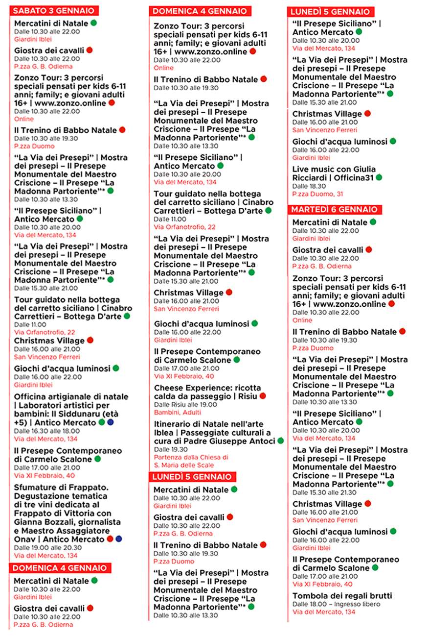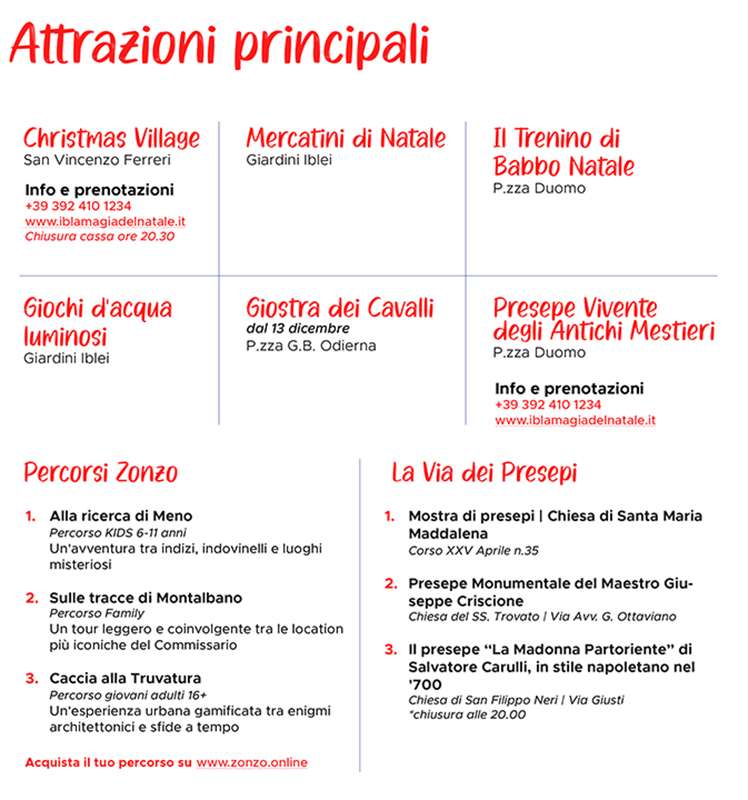 Le strade di Ibla si animano poi con la Via dei Presepi, ospitata nelle chiese del borgo, e con eventi musicali itineranti che diffondono atmosfera e allegria. Completano il programma i Percorsi a Zonzo, alla ricerca di Meno, sulle Tracce di Montalbano e con la suggestiva Caccia alla Truvatura, per vivere Ragusa Ibla in modo curioso e affascinante.