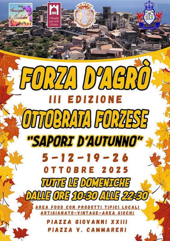 L’Ottobrata Forzese è un affascinante evento che trasforma il pittoresco borgo di Forza d’Agrò, nel messinese, in un vivace e colorato scenario di tradizioni, cultura e divertimento. Questa festa, in programma ogni domenica di ottobre, si svolge in Piazza Giovanni XXIII e in Piazza V. Cammareri e offre un’ampia esposizione di prodotti tipici, regalati dall’incantevole autunno.