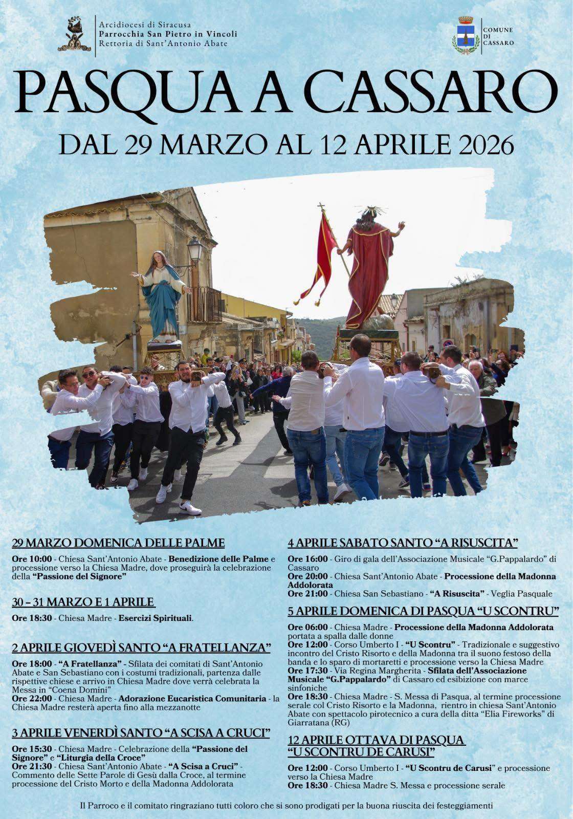 La mattina di Pasqua inizia con la statua dell’Addolorata, portata a spalla dalle donne, che percorre le vie del paese alla ricerca del Figlio. Il culmine si raggiunge a mezzogiorno su corso Umberto con “U Scontru”: la Madonna, vestita di nero, corre incontro al Cristo Risorto; al momento dell’incontro, il manto nero cade, simboleggiando la fine del lutto e la gioia della Resurrezione. Il tutto è accompagnato da spari di mortaletti, lancio di ‘nzareddi e dalla musica festosa della banda. La giornata si conclude con la Messa solenne in Chiesa Madre e la processione serale delle statue, seguita da spettacolari fuochi d’artificio. Una settimana dopo, la tradizione continua con “U Scontru de’ Carusi”, in cui i ragazzi del paese ripetono il rito pasquale con statue più piccole, rinnovando così il legame tra passato, presente e futuro. La Pasqua di Cassaro non è solo un evento religioso, ma un patrimonio culturale e identitario che unisce generazioni, mantenendo viva una tradizione secolare che continua a emozionare e coinvolgere chiunque vi prenda parte.