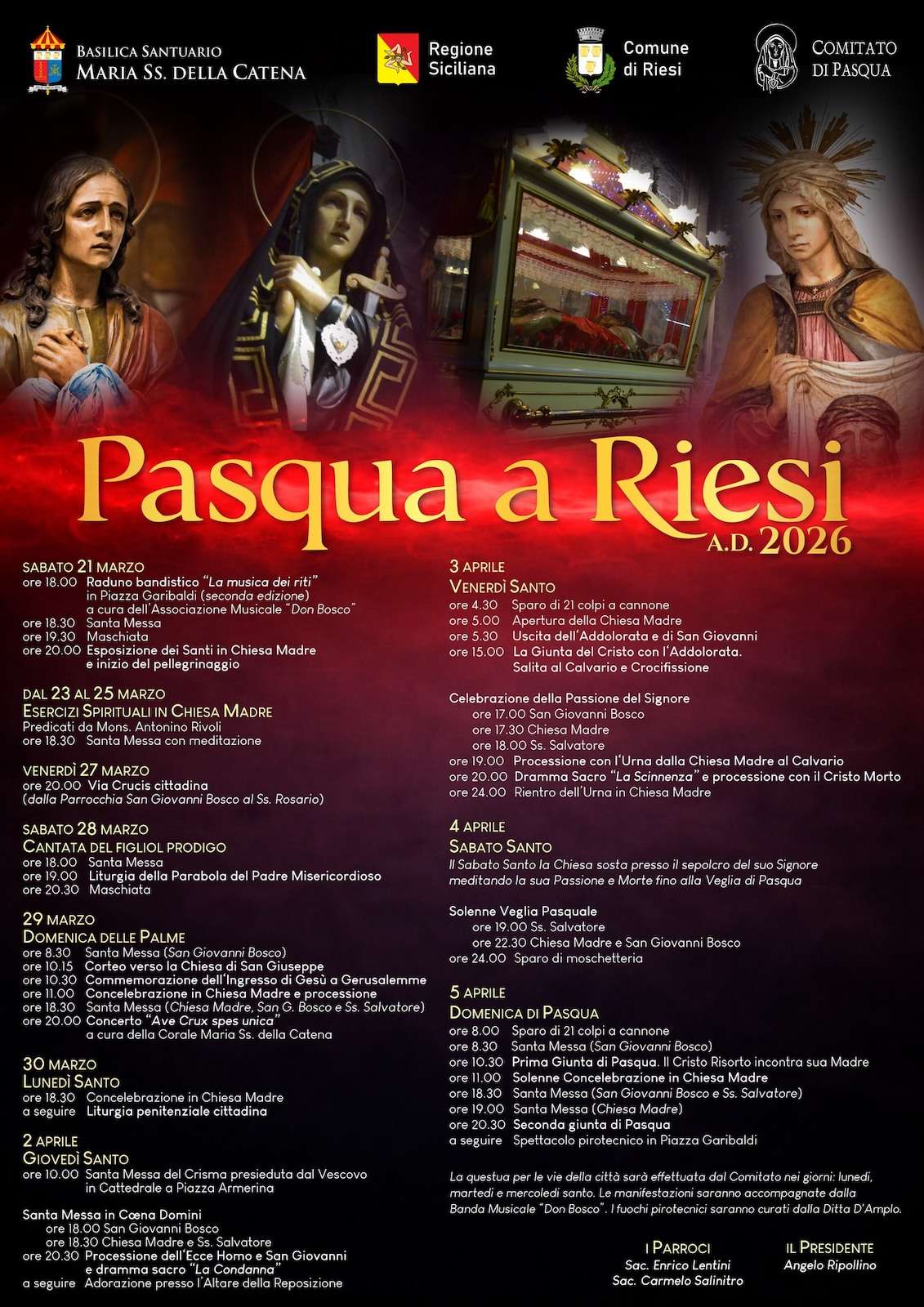 Le celebrazioni dei riti della Settimana Santa di Riesi entrano nel vivo col Triduo Pasquale ma iniziano già la Domenica delle Palme, con la commemorazione dell’Ingresso di Gesù a Gerusalmme, la processione che si muove dalla Chiesa Madre verso Piazza del SS. Crocifisso per la benedizione delle Palme, per poi far ritorno alla Basilica di Maria SS. della Catena, dove viene celebrata la Messa. Subito dopo si svolge la prima processione della Settimana Santa di Riesi, che accompagna i Santi Pietro e Paolo per le vie del centro. Le celebrazioni riprenderanno il Giovedì Santo con la Messa in Coena Domini e l’Adorazione presso l’Altare della Reposizione fino a tarda notte. Al calar della sera, le statue di San Giovanni e dell’Ecce Homo escono dalla Chiesa del SS. Crocifisso e vengono condotti fino alla scalinata di San Giuseppe, dove va in scena la rappresentazione della “condanna”. Il giorno successivo è quello più atteso dai riesini che rivivono con religiosità e commozione i momenti della Passione di Gesù Cristo, dalle prime luci dell’alba fino a notte inoltrata.
