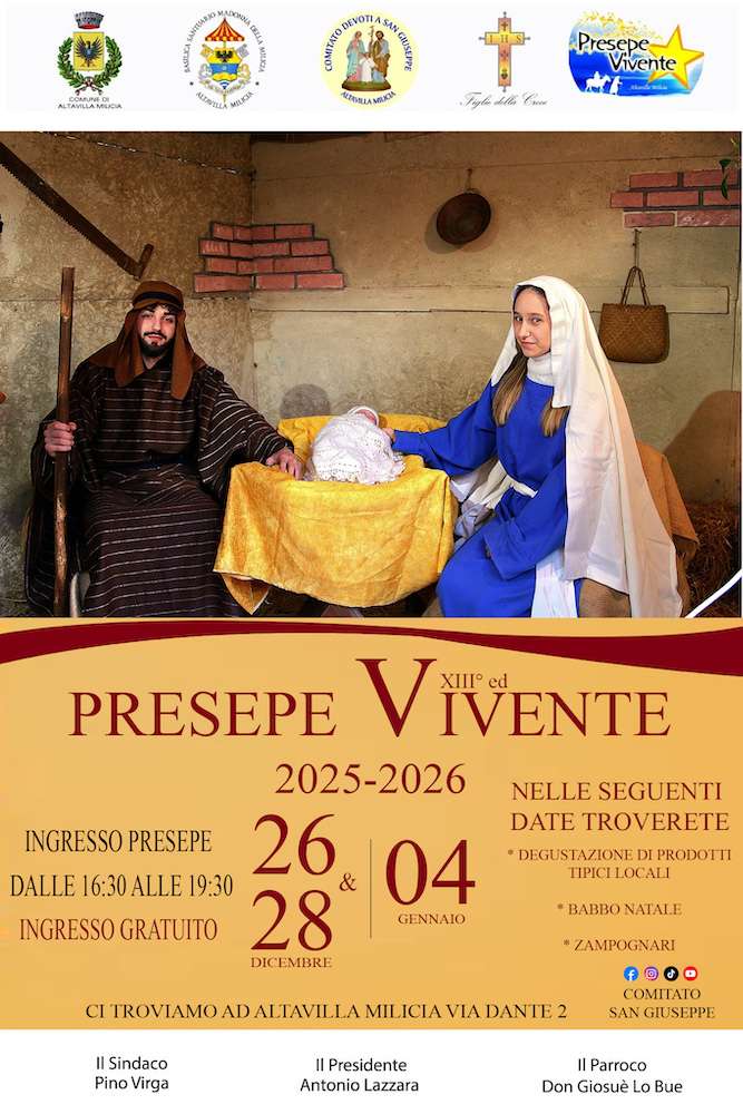 Un appuntamento che ormai è entrato a far parte delle tradizioni natalizie altavillesi, il Presepe Vivente di Altavilla Milicia si distingue ogni anno per la cura e l’attenzione ai dettagli, arricchendosi continuamente di nuovi personaggi e scenografie. Numerose le comparse che animano il presepe, affiancate da un grande team di tecnici e volontari che, con dedizione e passione, si occupano di ogni aspetto: dalla realizzazione delle maestose scenografie alla preparazione degli abiti d’epoca, fino alla sistemazione degli attrezzi che raccontano gli antichi mestieri. Questo evento è il frutto dell’impegno instancabile di tante famiglie e giovani del paese che, mossi dalla gratuità e dallo spirito di comunità, contribuiscono a creare un’esperienza unica. Grazie al lavoro del Comitato di San Giuseppe, il Presepe Vivente ad Altavilla Milicia non è solo un’occasione per immergersi nella magia del Natale, ma un momento per vivere con più fede e intensità il periodo natalizio.