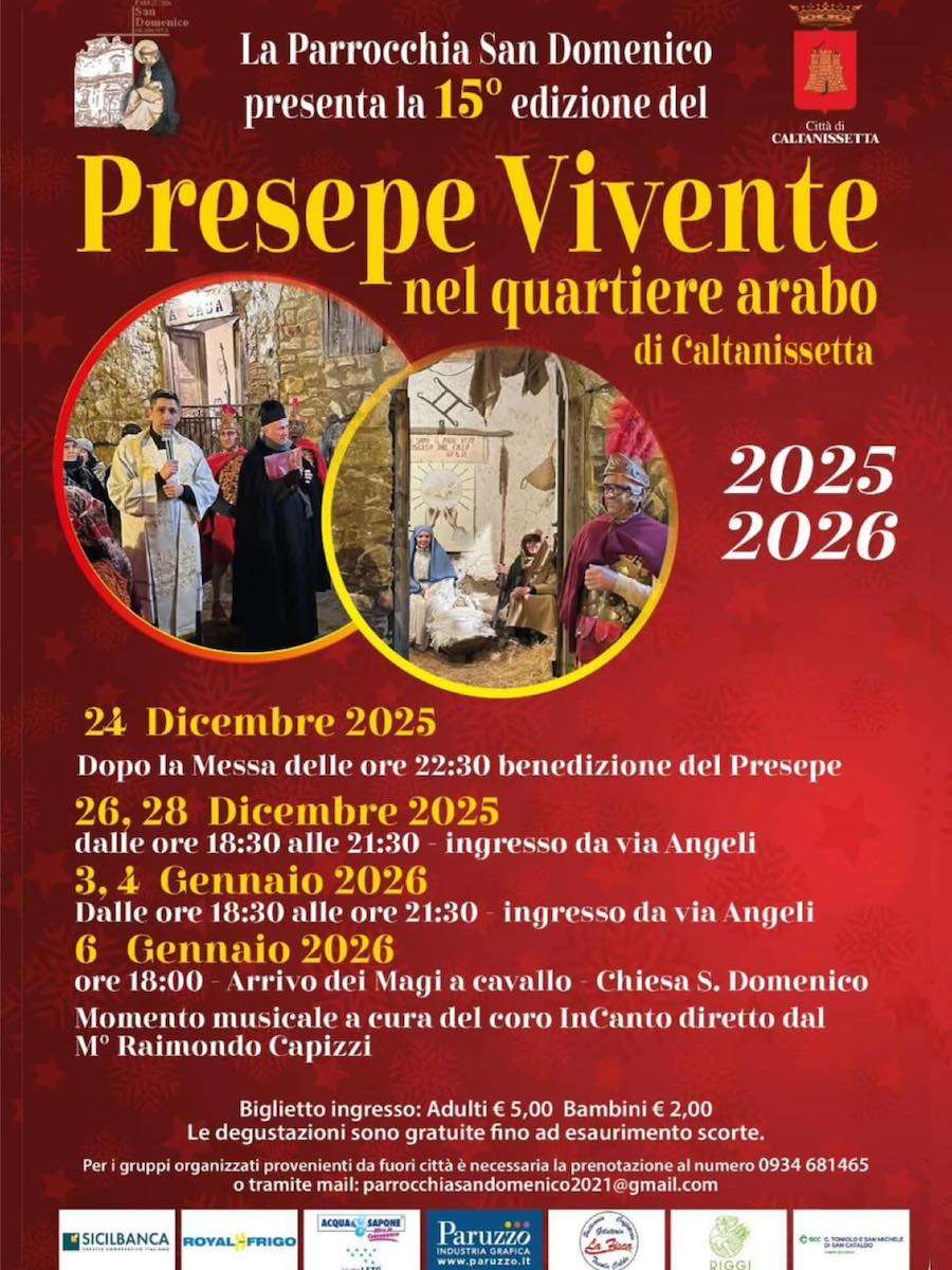 Il Presepe Vivente di Caltanissetta 2025 è in programma il 26 e 28 dicembre e il 3, 4 e 6 gennaio 2026 dalle ore 18,30 alle ore 21,30. Biglietto ingresso adulti 5€, bambini 2€.
