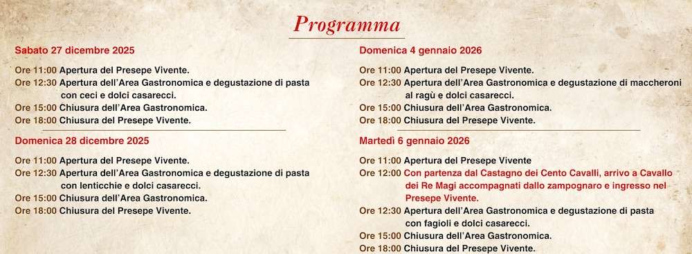 Il Presepe vivente dell’Etna 2025 a Sant’Alfio è in programma il 27 e 28 dicembre e il 4 e 6 gennaio 2026.