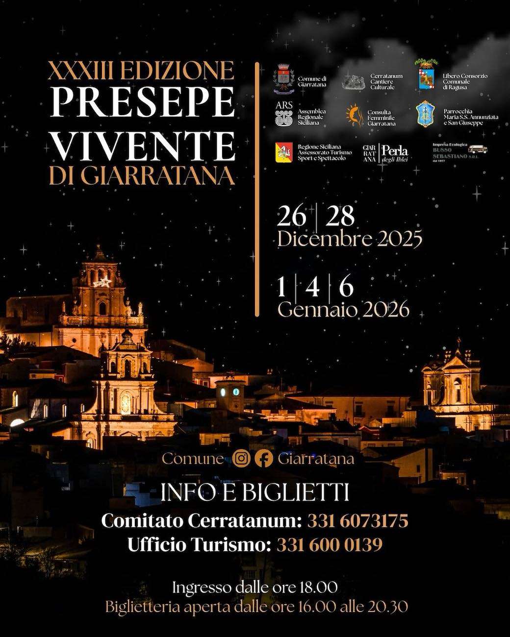 La nuova edizione del Presepe vivente di Giarratana, che nel 2013 è stato premiato come “Miglior Presepe Vivente di Sicilia” e negli anni successivi come “Miglior Presepe Vivente d’Italia”, organizzato dall’Associazione Culturale “Cerretanum”, si svolgerà nelle giornate del 26 e 28 dicembre e 1, 4 e 6 gennaio 2026.
