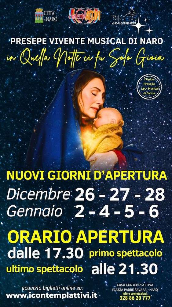 Quello che va in scena a Naro è l’unico Presepe Musical di Sicilia, si terrà dal 20 dicembre al 6 gennaio 2026, e rappresenta un’opportunità imperdibile per chiunque voglia riscoprire le tradizioni del Natale in un contesto unico e suggestivo. Grazie alla dedizione della compagnia teatrale “I ContemplAttivi”, il presepe oltre ad essere una rappresentazione della Natività, diventa un’occasione per riunire la comunità e offrire ai visitatori un momento di riflessione e serenità. La rappresentazione include una serie di scene teatrali per raccontare e teatrali per raccontare la storia d’amore più bella di sempre dove ogni dettaglio è pensato per emozionare e toccare il cuore di chiunque partecipi all’evento, rendendolo un’esperienza che va oltre la semplice osservazione.