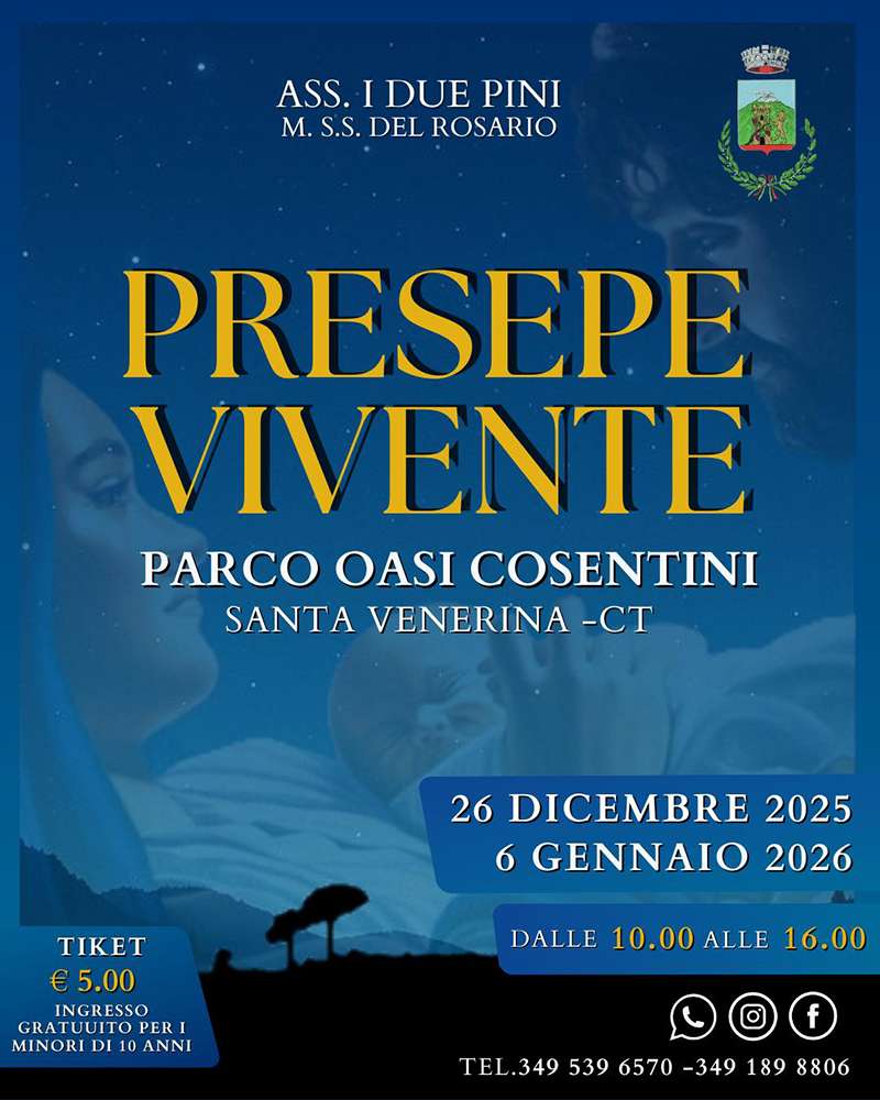 Il Presepe Vivente 2025 di Santa Venerina è in programma il 26 dicembre e il 6 gennaio 2026, dalle ore 10,00 alle 16,00. L’ingresso è di 5 euro e i bambini fino a 10 anni entrano gratis.