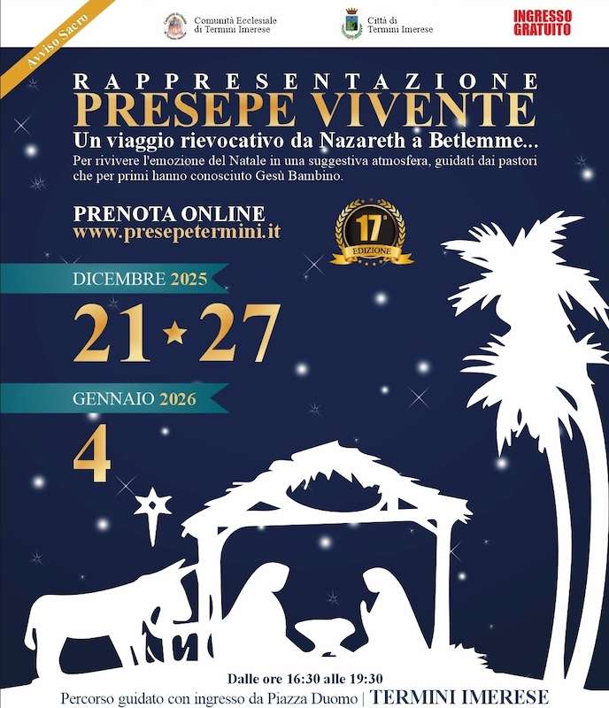 A Termini Imerese il Presepe vivente prenderà inizio da Piazza Duomo e sarà visitabile dalle ore 16,30 alle ore 19,30. I biglietti sono organizzati a fasce orarie e la visita avrà durata di circa 100 minuti. L’evento è gratuito, prenotazione obbligatoria sul sito ufficiale www.presepetermini.it.
