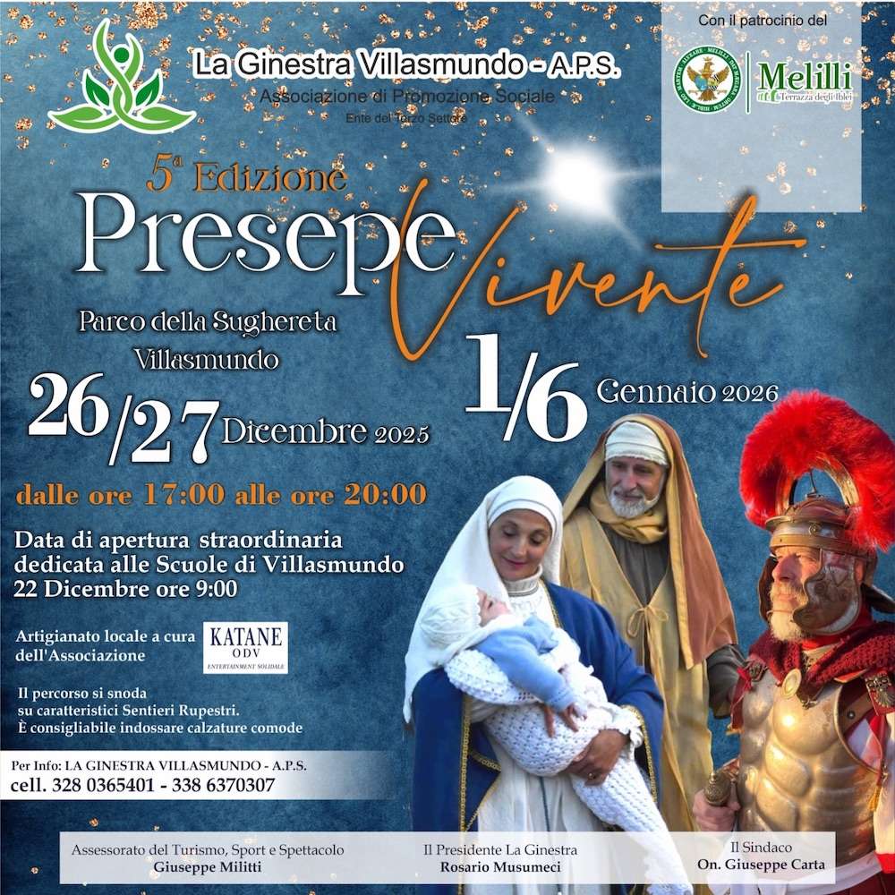Il Presepe Vivente di Villasmundo prende vita all’interno di un suggestivo scenario naturale dove per l’occasione sono state ricostruite le capanne con i mestieri e la rappresentazione della Natività. La sughereta di Villasmundo ha un grande valore naturalistico e paesaggistico e nei giorni di Natale si anima con la rappresentazione di un Presepe vivente, organizzato dall’ass. La Ginestra Villasmundo A.P.S. con il patrocinio del Comune di Melilli, al quale partecipano molti volontari che con passione e amore per il proprio territorio, cominciano molto tempo prima a dedicarsi alla preparazione di questo evento, per regalare ai visitatori un’esperienza unica nel suo genere.