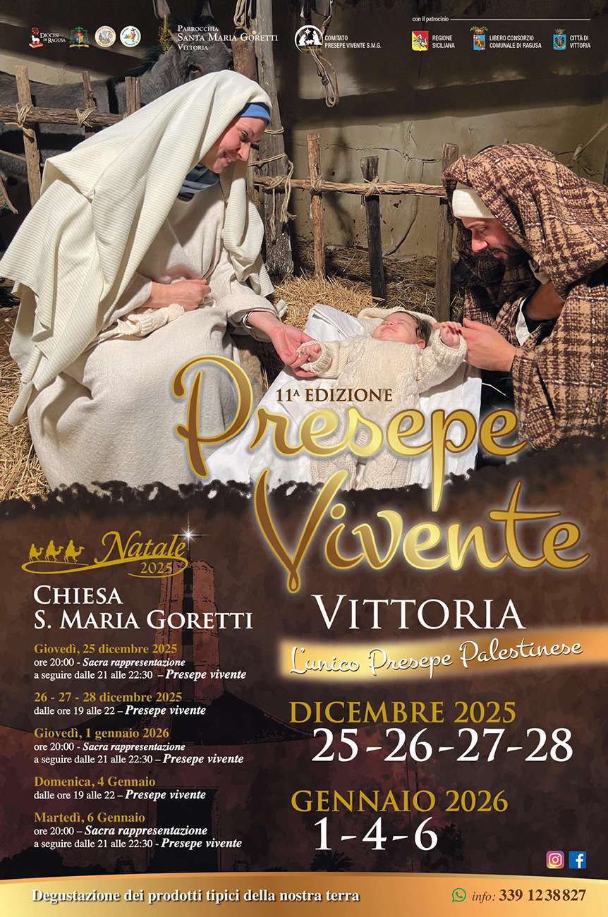 Il Presepe vivente di Vittoria presso la parrocchia Santa Maria Goretti, dove rivivono la tradizione e la devozione religiosa attraverso la rappresentazione della Natività tra gli antichi mestieri arabi ed ebraici e la degustazione dei prodotti tipici.