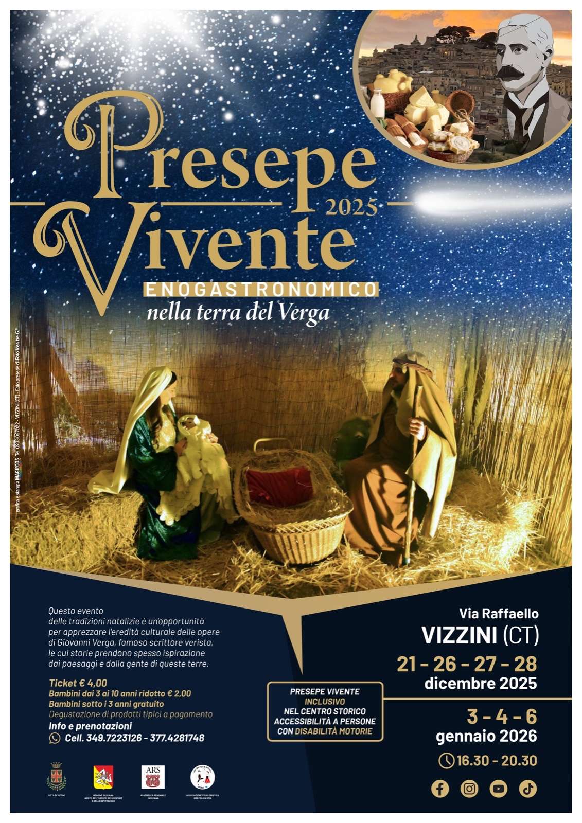 Il Presepe Vivente 2025 a Vizzini è in programma il 21, 26, 27 e 28 dicembre e il 3, 4 e 6 gennaio 2026. Presepe Vivente Inclusivo: il presepe è visitabile anche da persone con disabilità motorie.