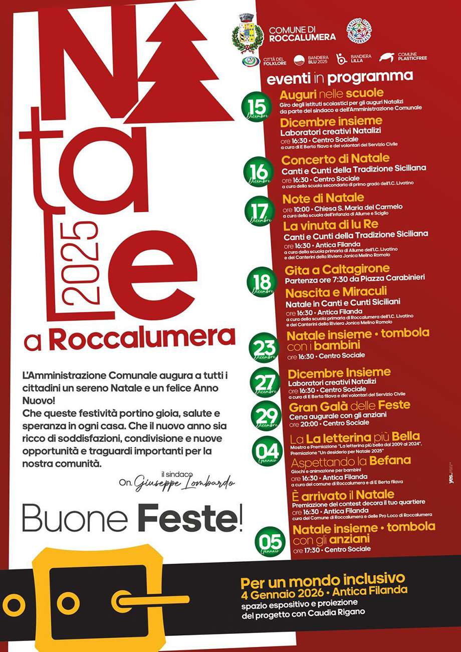 Il Natale a Roccalumera si distingue per un programma ricco e variegato, che spazia tra eventi musicali, appuntamenti gastronomici, manifestazioni sportive, rappresentazioni teatrali e tradizioni popolari, regalando momenti di divertimento e solidarietà per tutte le età.