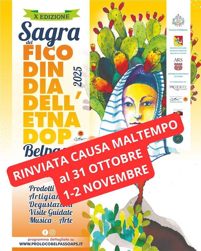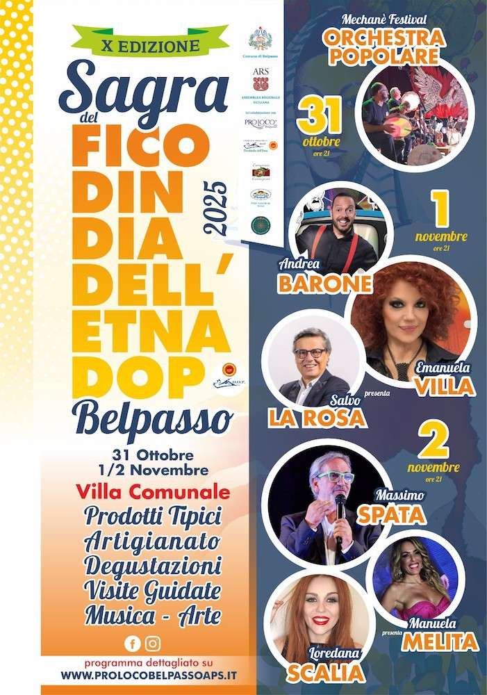 Dal 31 ottobre al 2 novembre a Belpasso si svolgerà la Sagra del ficodindia dell’Etna D.O.P. che ha lo scopo di promuovere una delle eccellenze del territorio belpassese e etneo. La zona di produzione del Ficodindia dell’Etna D.O.P. comprende i territori ubicati ad una altitudine che va dai 150 ai 750 m. s.l.m., caratterizzati da terreni lavici, dei comuni di Adrano, Belpasso, Biancavilla, Bronte, Camporotondo Etneo, Paternò, Ragalna e Santa Maria di Licodia.