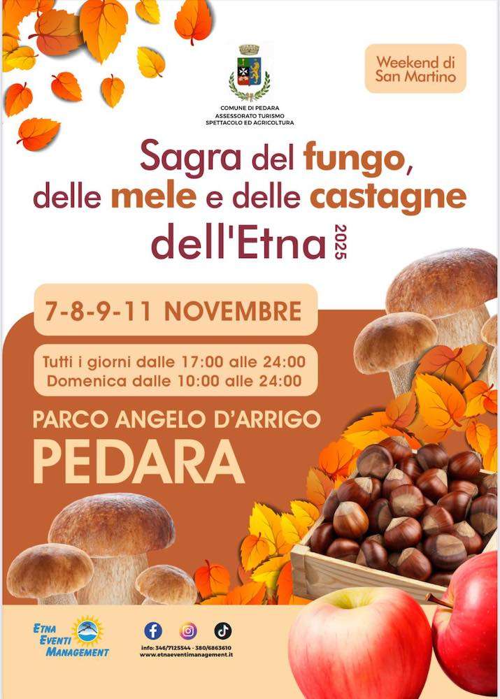 La Sagra del fungo, delle mele e delle castagne dell’Etna, organizzata da Etna Eventi Management, si svolgerà a novembre presso il Parco Angelo D’Arrigo. Gli ospiti nei giorni della sagra di Pedara saranno intrattenuti con numerosi spettacoli, gastronomia, visite guidate, show cooking e non mancheranno il luna park e l’area giochi per il divertimento dei più piccoli. Negli stand allestiti per l’occasione, oltre che acquistare i prodotti tipici dell’Etna e i manufatti di artigianato, si potranno degustare i deliziosi funghi nelle varianti più sfiziose e cucinati secondo le ricette del posto.