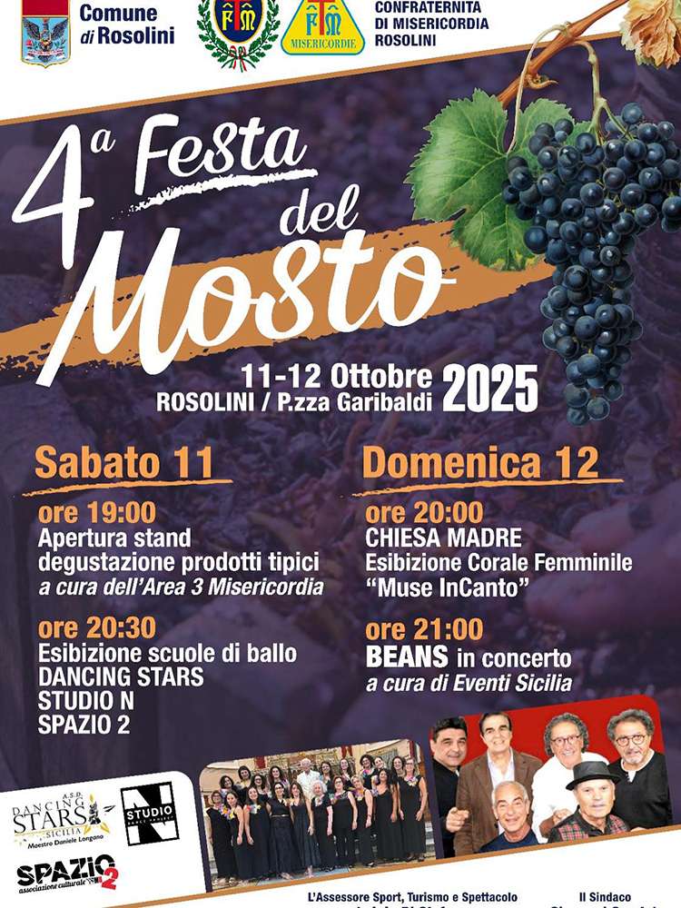 Durante i giorni della Festa del Mosto di Rosolini, quest’anno in programma l’11 e il 12 ottobre, si potranno degustare i mucatoli, la mostata calda e secca, i purcidduzzi, le crispelle, la cuccia, mpanatigghi, ciambelle ed altre prelibatezze, oltre che acquistare i prodotti confezionati a base di mosto e vino cotto. La Sagra del mosto di Rosolini è organizzata dall’Associazione Misericordia che per l’occasione preparerà dal vivo per tutti i visitatori la mustata e le crespelle. La sagra del mosto di Rosolini si svolgerà in Piazza Garibaldi ed intratterrà gli ospiti con esibizioni di danza e spettacoli musicali.