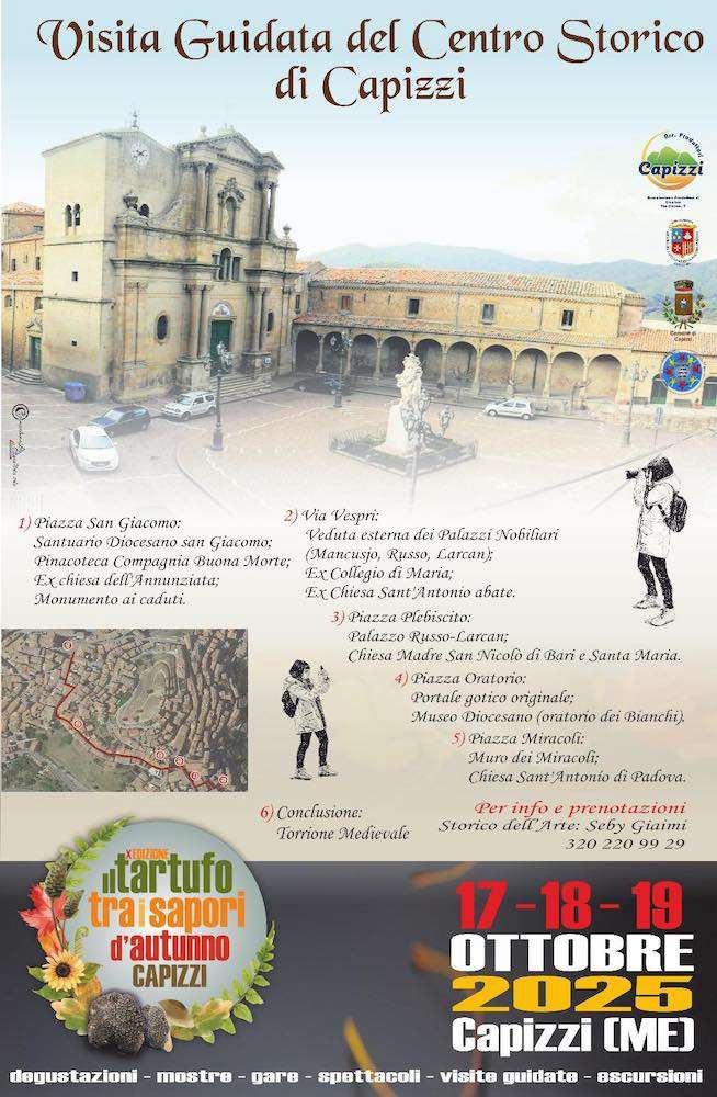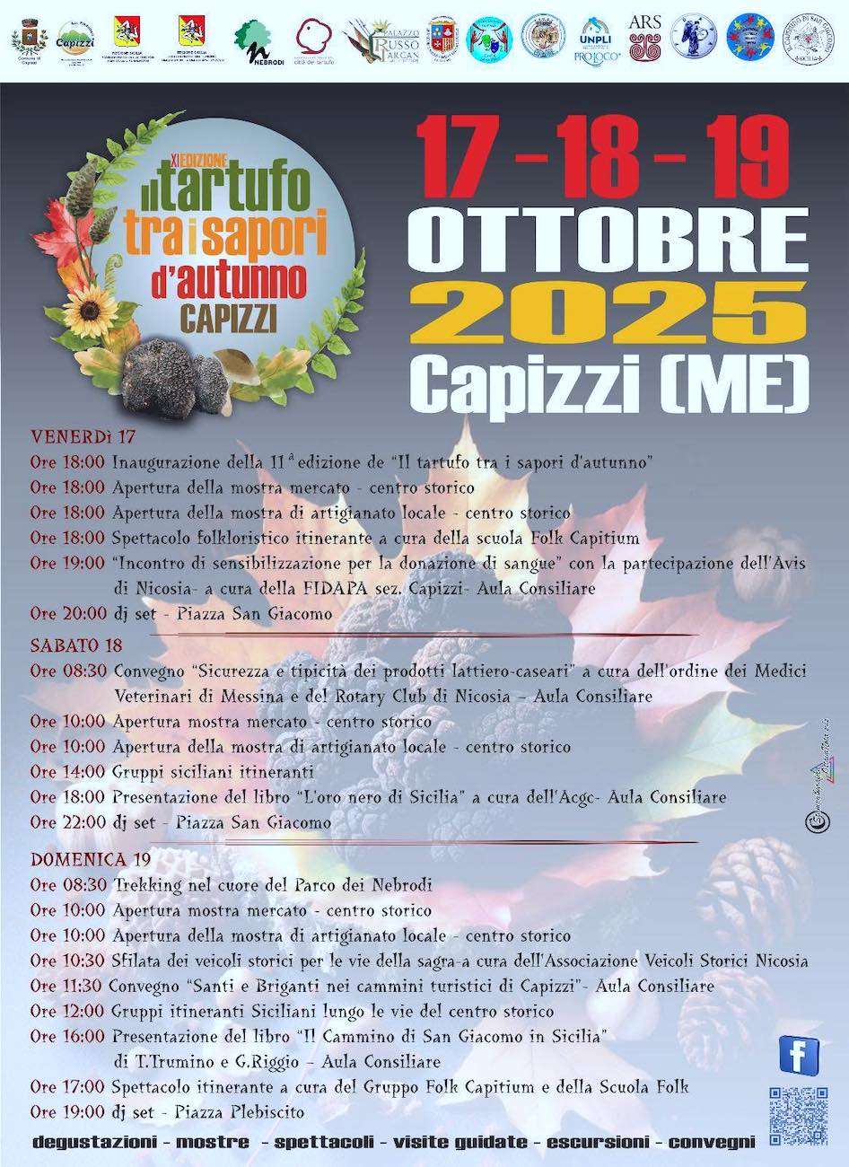 Durante la manifestazione, denominata Il Tartufo tra i Sapori d’Autunno vi saranno convegni, spettacoli folkloristici, la degustazione dei tartufi e dei prodotti tipici autunnali locali e le vie del centro accoglieranno mostre, visite guidate e spettacoli vari. La Sagra del tartufo dei Nebrodi di Capizzi sarà l’occasione per conoscere il territorio e le sue tradizioni e fare visita ai beni architettonici del paese, tra i quali spicca il santuario di San Giacomo Maggiore, la chiesa Jacobea più antica dell’isola.