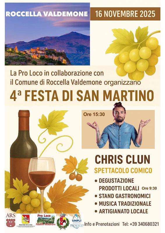 La Pro Loco di Roccella Valdemone nella giornata di domenica 16 novembre organizza la Festa di San Martino. La manifestazione si svolgerà nella centralissima Piazza Duomo di Roccella Valdemone dove saranno allestiti gli stand con i prodotti del territorio tipici della stagione autunnale. I visitatori potranno degustare u pani cunzatu con l’olio novello, caldarroste, formaggi, salumi, nocciole, cannoli alla castagna e altre prelibatezze, il tutto accompagnato dal buon vino locale, e saranno intrattenuti da spettacoli folkloristici.