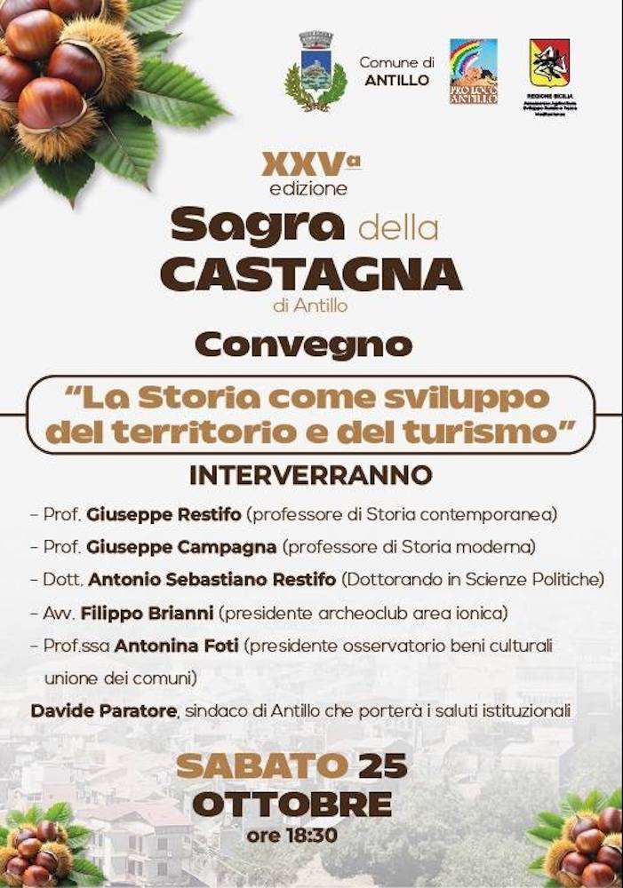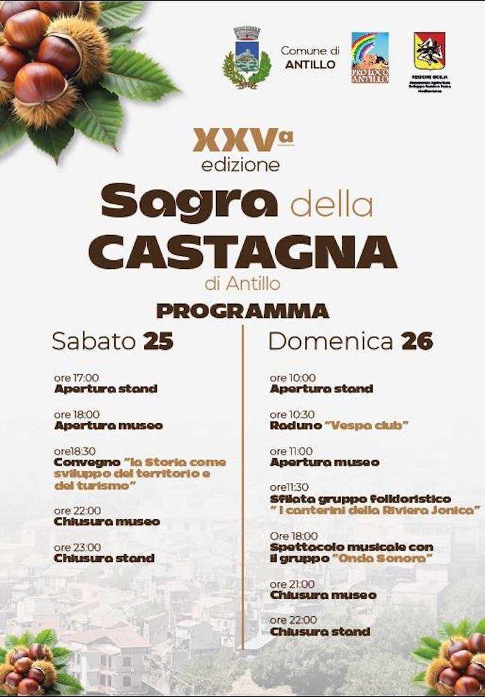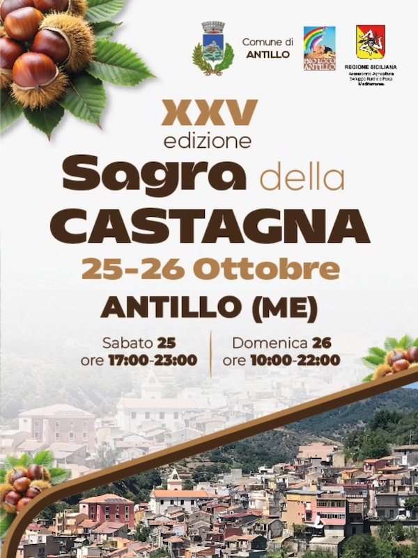 La Sagra della castagna di Antillo, in programma il 25 e il 26 ottobre offrirà l’occasione ai visitatori di scoprire il borgo di Antillo, il comune più interno della Valle d’Agrò. Nei due giorni della sagra della castagna ad Antillo si potranno visitare gratuitamente il museo dove sono esposti una moltitudine di oggetti della tradizione agricola e pastorale, che rappresenta la memoria storica della comunità antillese, le chiese e la Campana per la Pace, che sorge sul Pizzo Monaco, dedicata ai dispersi di tutte le guerre. Le giornate saranno allietate dalla musica e dalla esibizione del gruppo folkloristico.